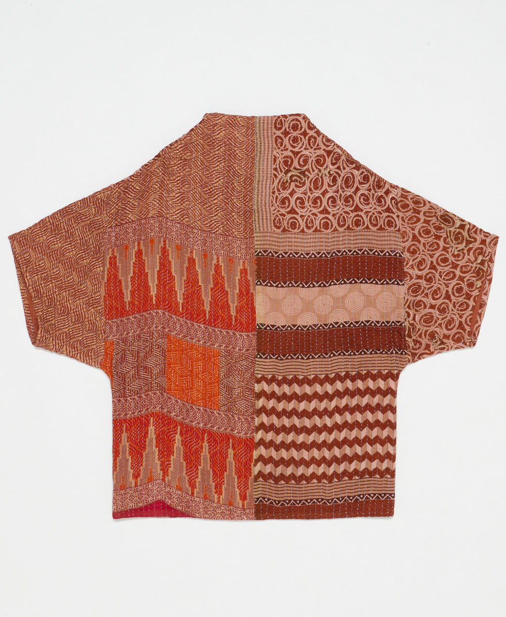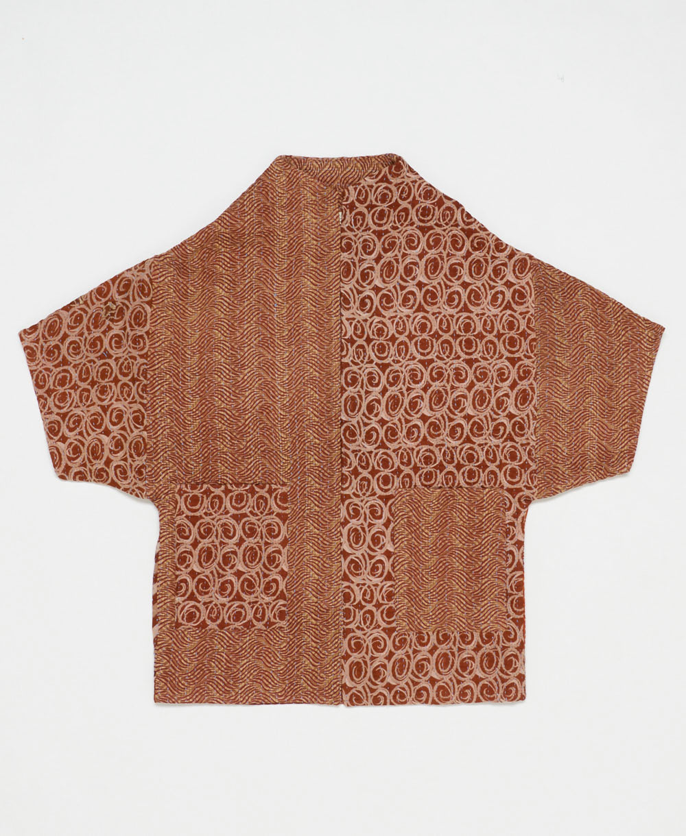 This brown swirl print cocoon quilted jacket is truly unique. No two are exactly alike, making it a one-of-a-kind wearable art piece. Constructed from 6 layers of upcycled cotton saris with all-over hand-stitching, this long quilted jacket will make you feel just like you’re cuddling up with your favorite quilt. Featuring two large front patch pockets for convenience and a modern cocoon neckline, this jacket will be one you reach for again and again. Layer it over a t-shirt or your favorite sweater for an effortless feel.