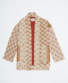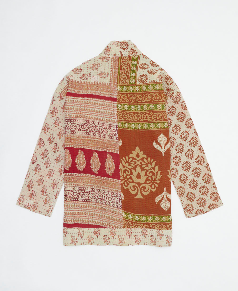 Upgrade your wardrobe with this one-of-a-kind open-front quilted jacket, adorned with a light red and muted red floral print, two large front pockets, and a cardigan jacket design with drop shoulder sleeves. Meticulously crafted and transformed from layers of vintage cotton saris, this unique jacket seamlessly blends the coziness of your favorite quilt with the charm of wearable art.