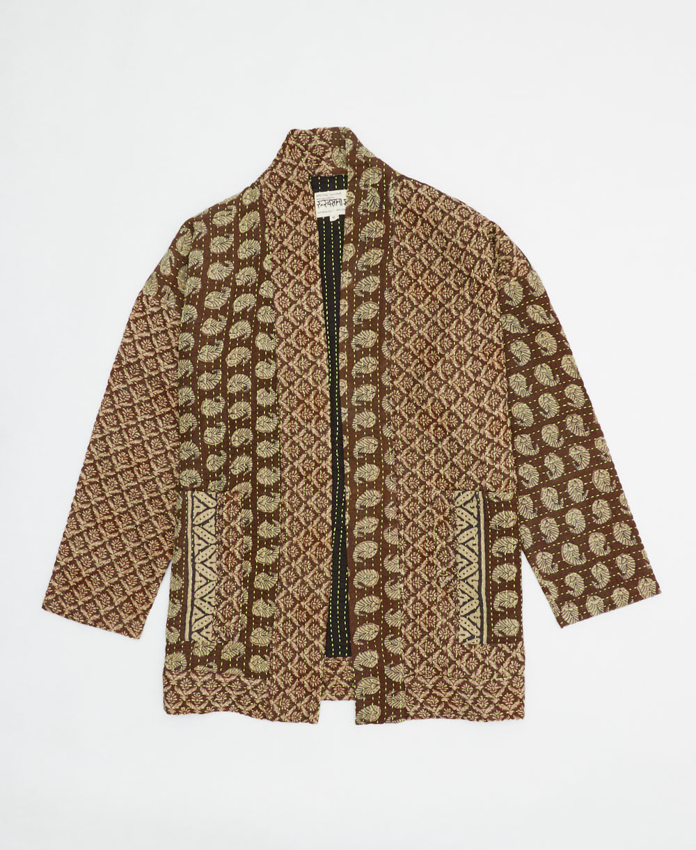 Upgrade your wardrobe with this one-of-a-kind open-front quilted jacket, adorned with a chocolate brown and light tan paisley print, two large front pockets, and a cardigan jacket design with drop shoulder sleeves. Meticulously crafted and transformed from layers of vintage cotton saris, this unique jacket seamlessly blends the coziness of your favorite quilt with the charm of wearable art.