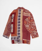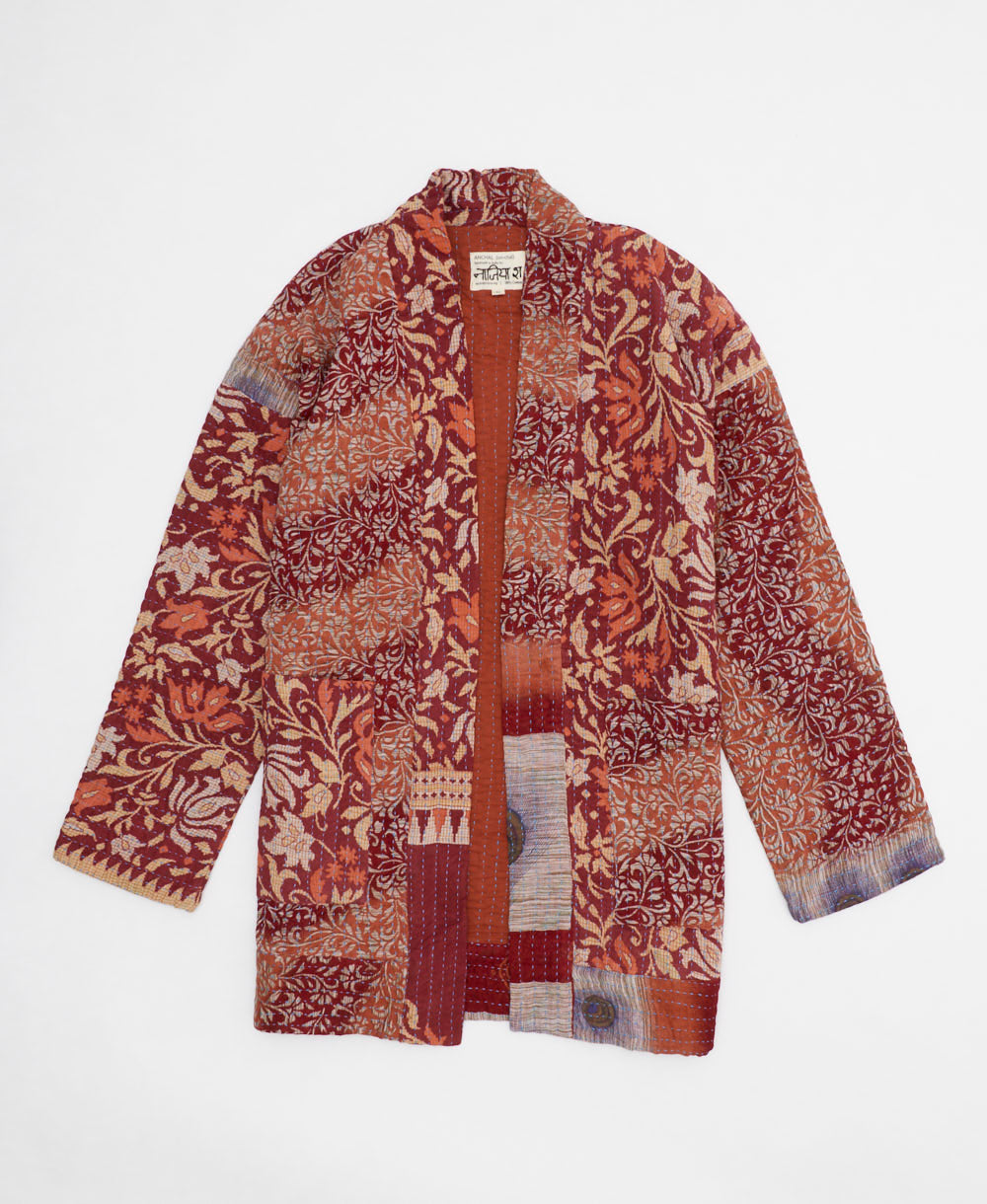 Upgrade your wardrobe with this one-of-a-kind open-front quilted jacket, adorned with a coral, tan, and crimson red bold floral print, two large front pockets, and a cardigan jacket design with drop shoulder sleeves. Meticulously crafted and transformed from layers of vintage cotton saris, this unique jacket seamlessly blends the coziness of your favorite quilt with the charm of wearable art.