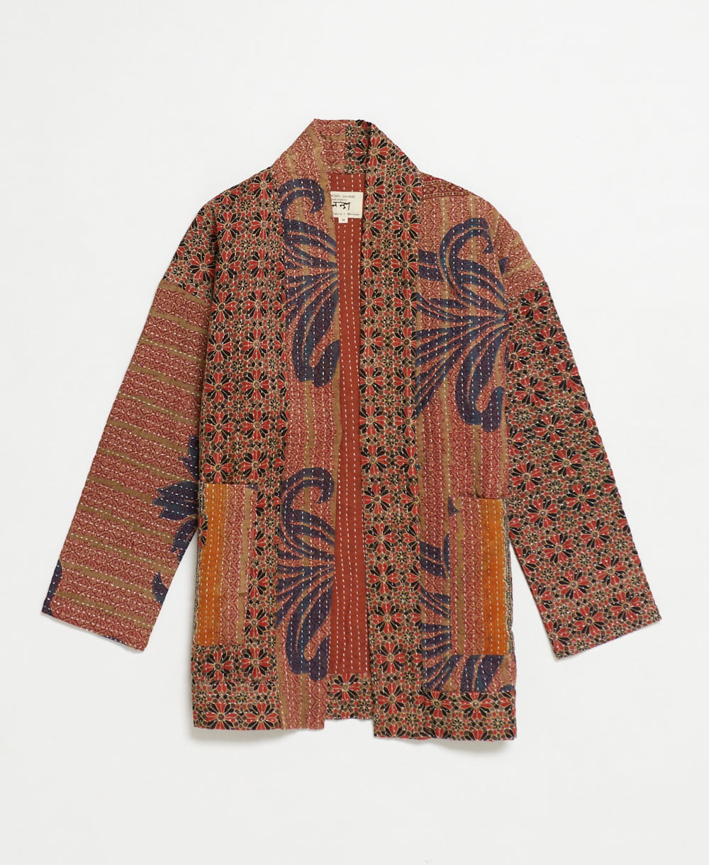 Upgrade your wardrobe with this one-of-a-kind open-front quilted jacket, adorned with two large front pockets, and a cardigan jacket design with drop shoulder sleeves. Meticulously crafted and transformed from layers of vintage cotton saris, this unique jacket seamlessly blends the coziness of your favorite quilt with the charm of wearable art.