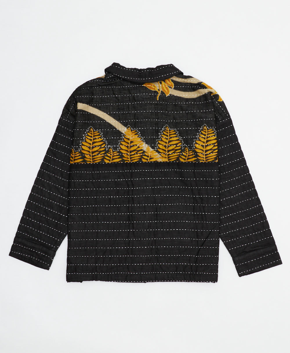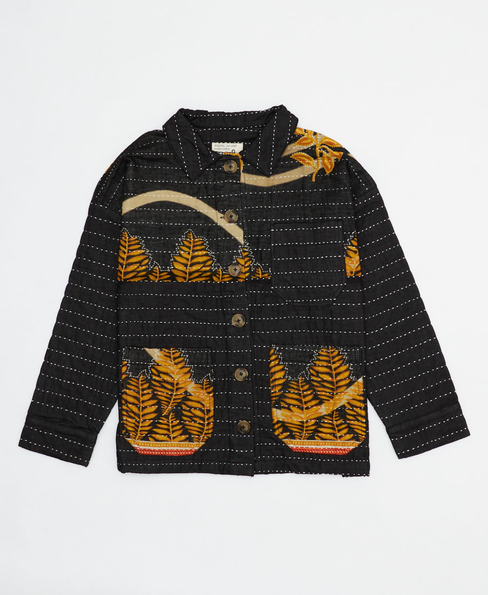 Meet your new favorite layer—the Quilted Chore Jacket in Charcoal! Made from 100% organic cotton and featuring one-of-a-kind vintage patchwork from repurposed cotton saris in a black and mustard yellow botanical print, this jacket is like wearing a cozy piece of art. With three patch pockets, hand embroidery, and tortoise-shell colored buttons for a dash of charm, it’s got personality in every stitch. Lightweight but sneakily warm, this size small chore jacket is perfect for throwing over a tee or sweater when fall or spring breezes call for something extra. Each jacket is totally unique, just like you!