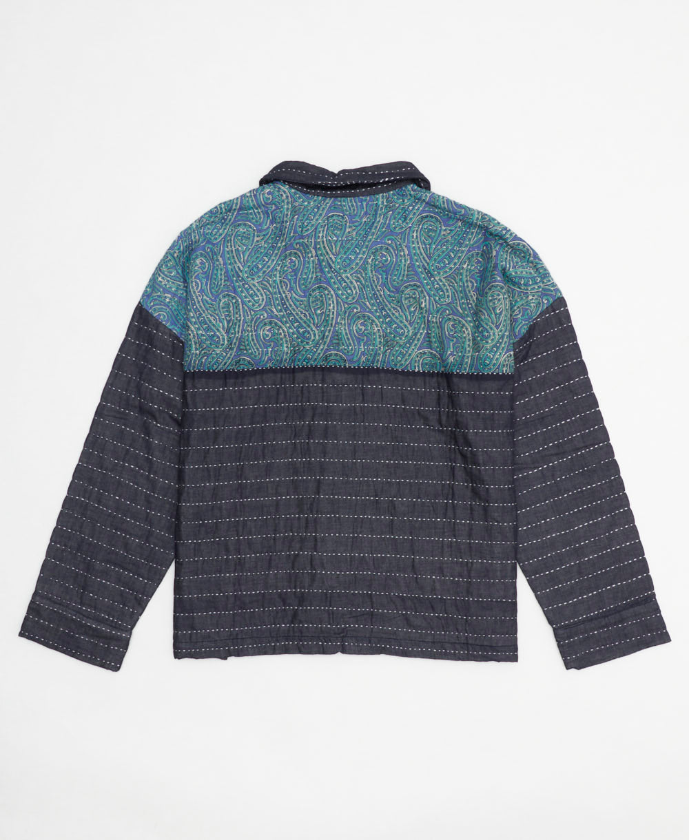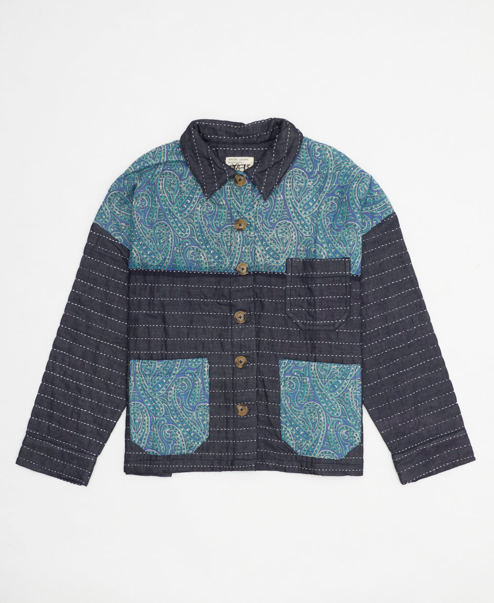 Meet your new favorite layer—the Quilted Chore Jacket in Navy! Made from 100% organic cotton and featuring one-of-a-kind vintage patchwork from repurposed cotton saris in a sky blue paisley print, this jacket is like wearing a cozy piece of art. With three patch pockets, hand embroidery, and tortoise-shell colored buttons for a dash of charm, it’s got personality in every stitch. Lightweight but sneakily warm, this navy chore jacket is perfect for throwing over a tee or sweater when fall or spring breezes call for something extra. Each jacket is totally unique, just like you!