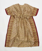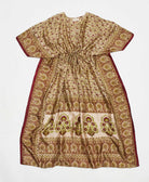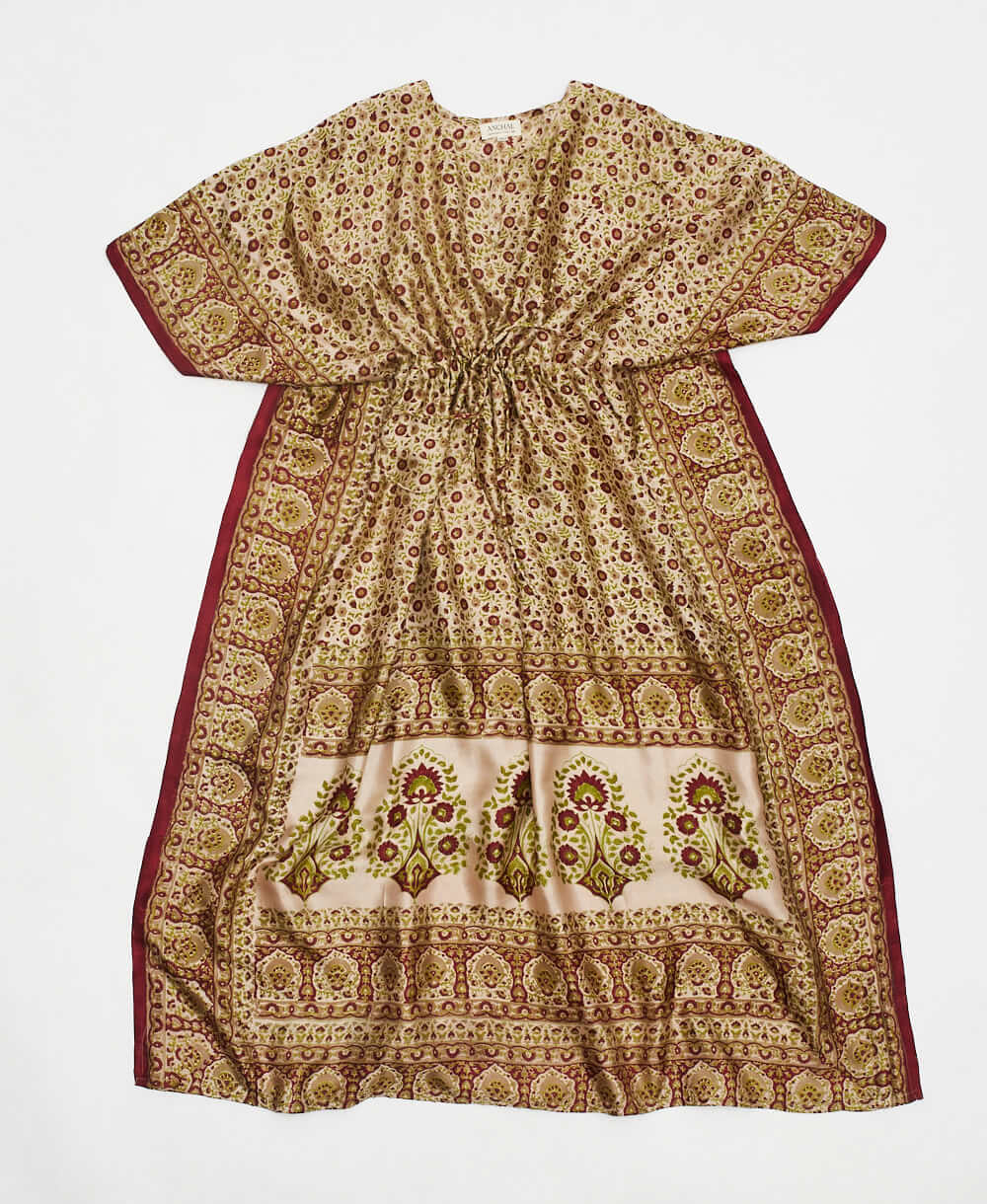 Slip into this unique silk kaftan dress, featuring a floral traditional design in pale green. With a light and airy feel and made sustainably from repurposed silk saris, each kaftan is one-of-a-kind. The adjustable empire waist with gold-tone beaded tie embellishments allows for a personalized fit. Perfect for any occasion, whether a fancy night out or a casual poolside gathering, this silk kaftan dress can be dressed up or down with matching accessories and shoes. It embodies a timeless, effortless appeal and is a must-have for the warmer months.