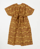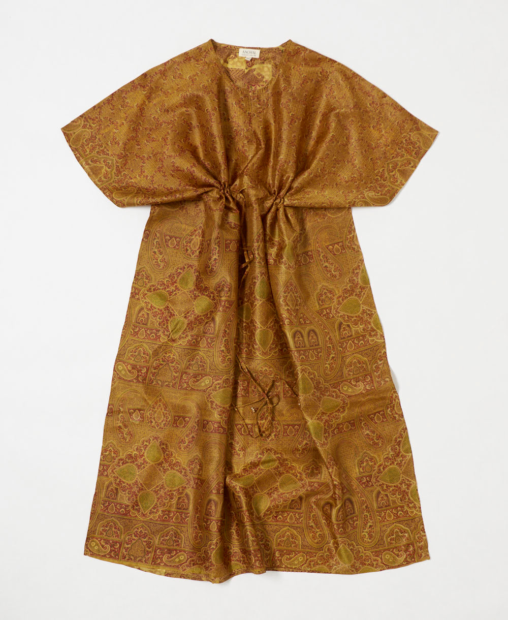 Slip into this unique silk kaftan dress with a light and airy feel. Made sustainably from repurposed silk saris, each kaftan is one-of-a-kind. The adjustable empire waist with gold-tone beaded tie embellishments allows for a personalized fit. Perfect for any occasion, whether a fancy night out or a casual poolside gathering, this silk kaftan dress can be dressed up or down with matching accessories and shoes. It embodies a timeless, effortless appeal and is a must-have for the warmer months.