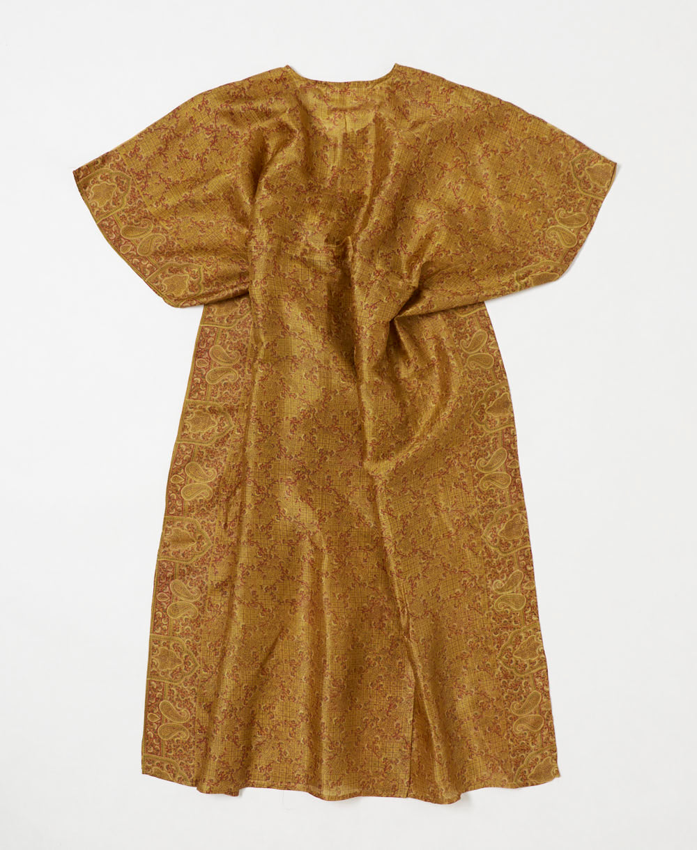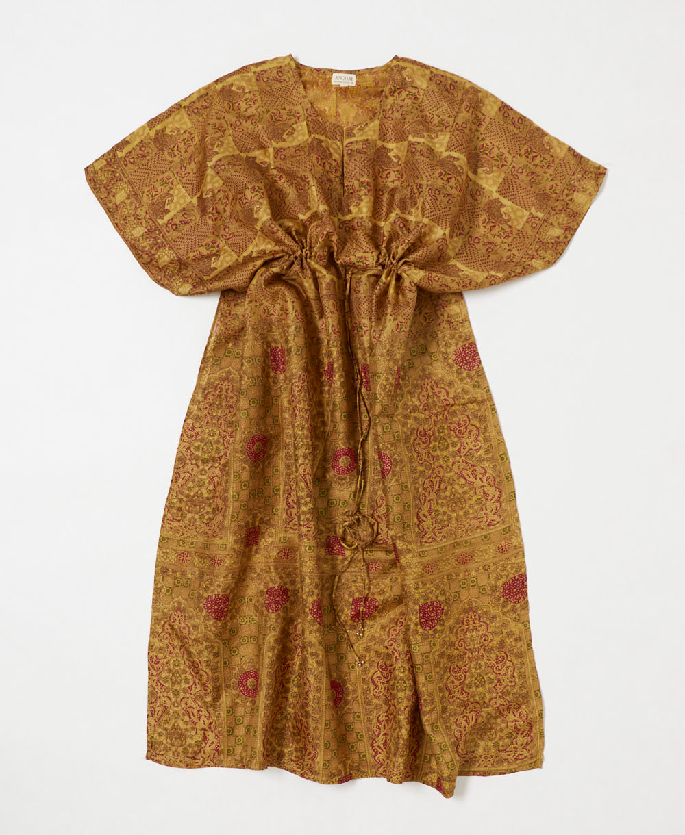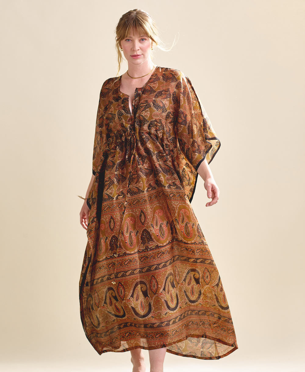 Slip into this unique silk kaftan dress with a light and airy feel. Made sustainably from repurposed silk saris, each kaftan is one-of-a-kind. The adjustable empire waist with gold-tone beaded tie embellishments allows for a personalized fit. Perfect for any occasion, whether a fancy night out or a casual poolside gathering, this silk kaftan dress can be dressed up or down with matching accessories and shoes. It embodies a timeless, effortless appeal and is a must-have for the warmer months.
