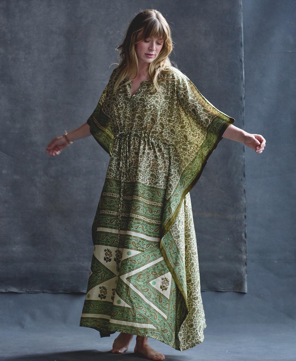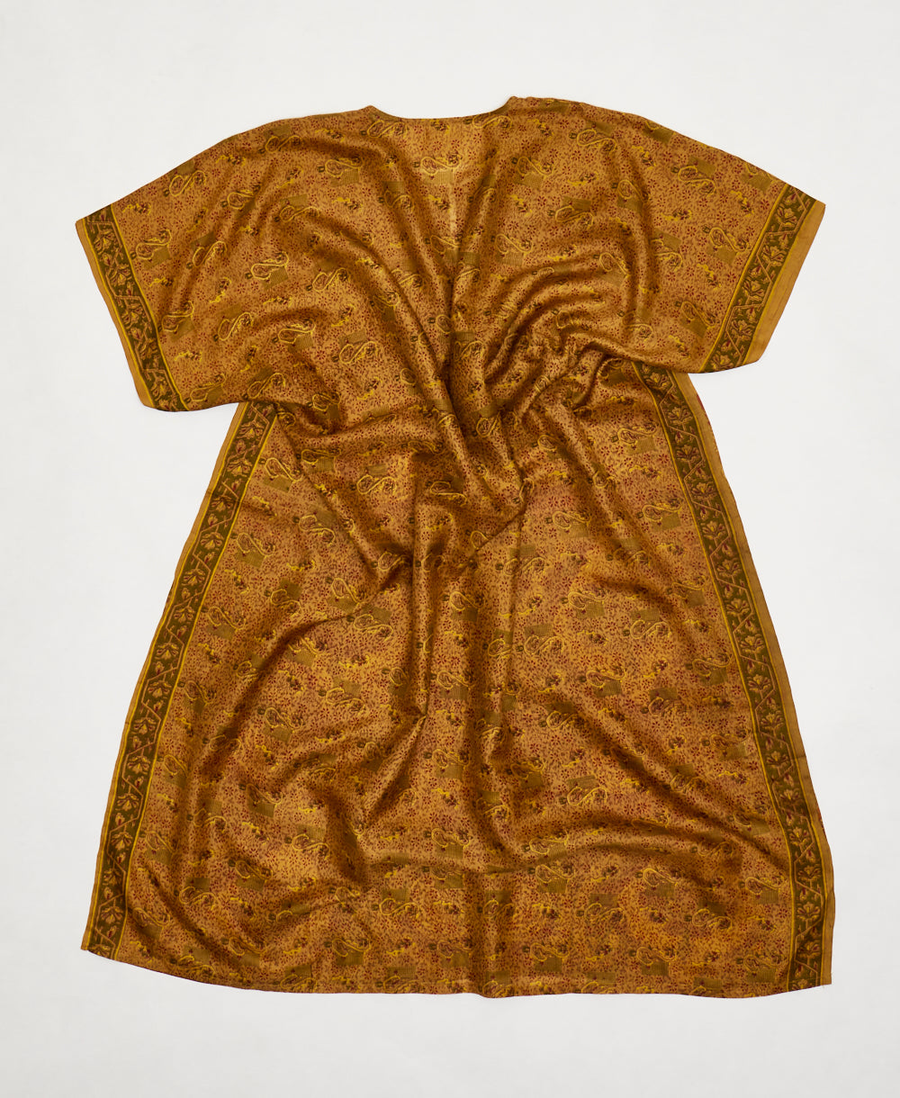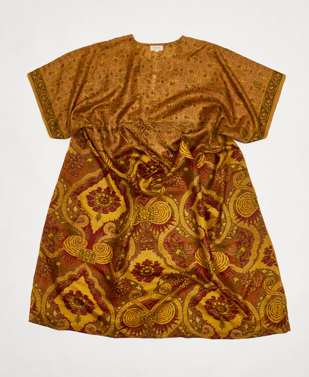 Slip into this unique silk kaftan dress, featuring an oversized paisley design in a rust orange hue. With a light and airy feel and made sustainably from repurposed silk saris, each kaftan is one-of-a-kind. The adjustable empire waist with gold-tone beaded tie embellishments allows for a personalized fit. Perfect for any occasion, whether a fancy night out or a casual poolside gathering, this silk kaftan dress can be dressed up or down with matching accessories and shoes. It embodies a timeless, effortless appeal and is a must-have for the warmer months.