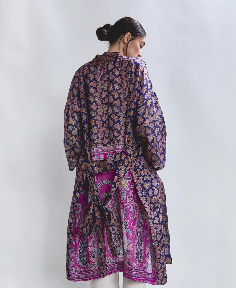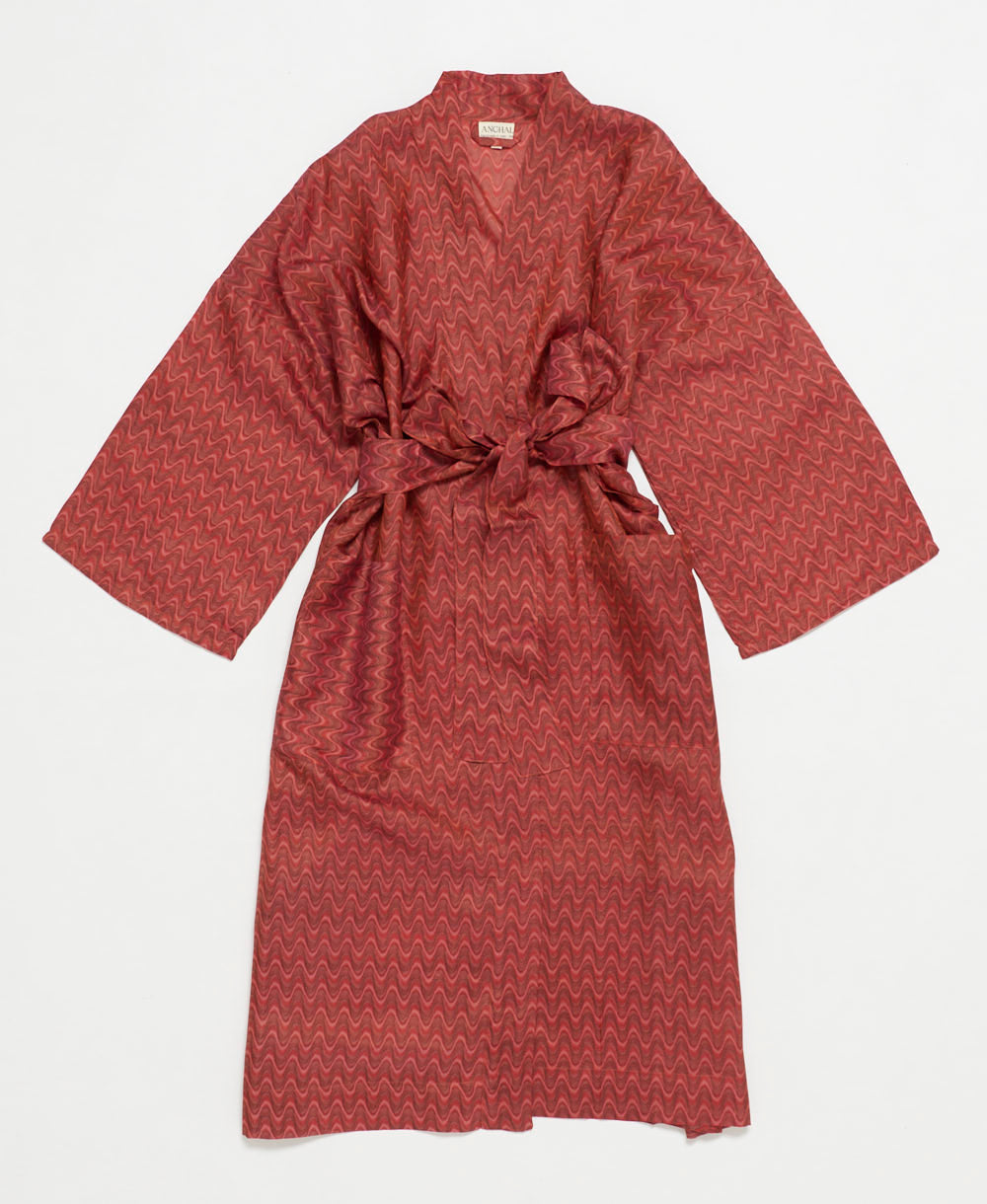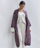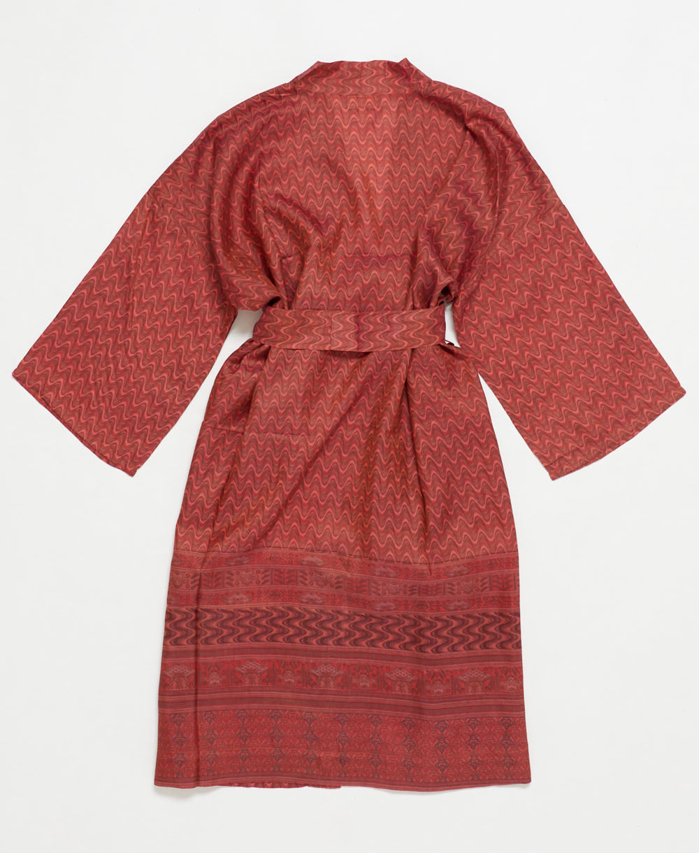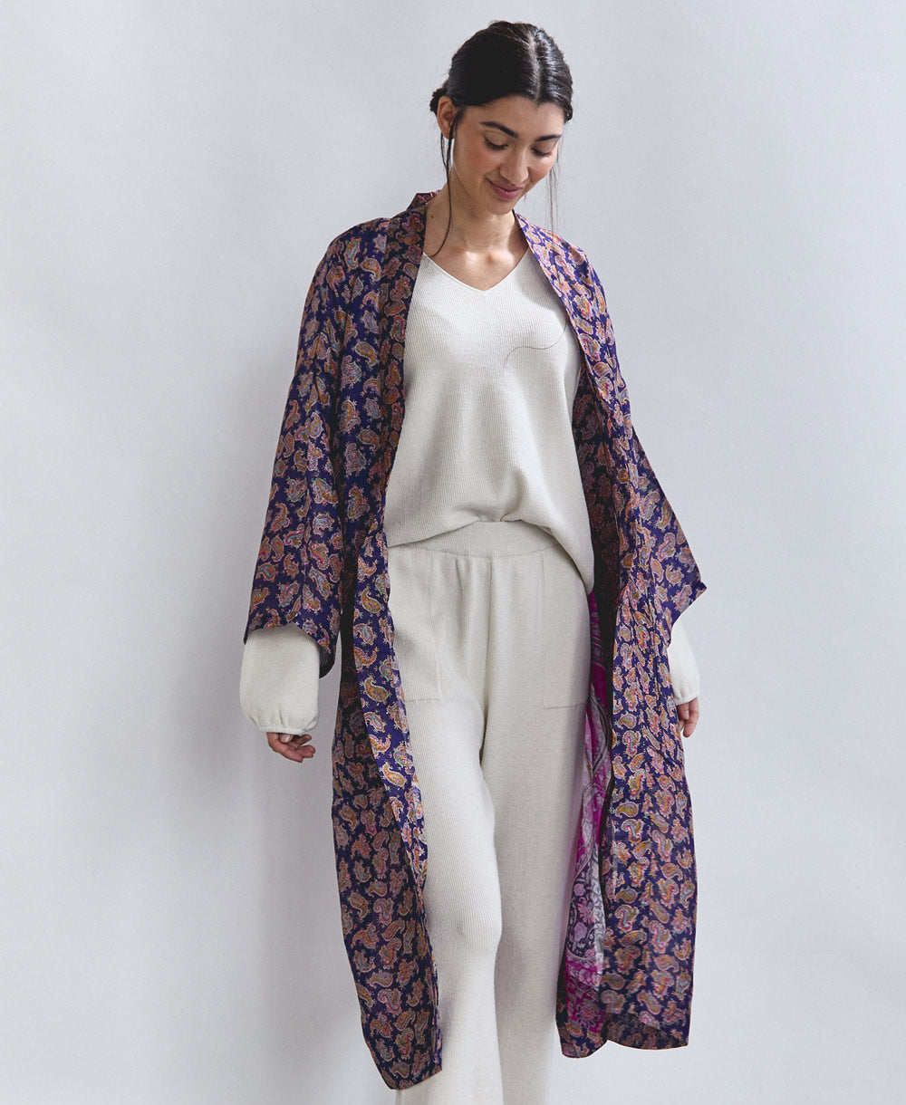 Upgrade your loungewear with this breezy silk robe made from repurposed vintage saris. Designed with boxy 3/4 length drop shoulder sleeves and an adjustable tie belt closure for a custom fit, this silk robe hits just below the knee for a luxurious aesthetic. Perfect for everyday lounging or getting ready for a night out, the silky fabric glides against your skin to keep you cool. There's even a loop sewn into the collar to easily hang it up after wearing.