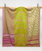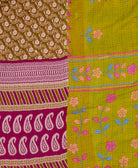This queen kantha quilt is expertly hand-stitched from start to finish using layers of the highest quality vintage cotton saris. Every stitch reflects our dedication to craftsmanship, ensuring each kantha blanket is not only a functional item but also a work of art. With each quilt being completely one-of-a-kind and unique in pattern, it becomes a statement piece in any room it graces. The signature of the artisan maker on the tag also adds a personal connection, allowing you to appreciate the hands that created it.