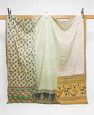 This queen kantha quilt is expertly hand-stitched from start to finish using layers of the highest quality vintage cotton saris. Every stitch reflects our dedication to craftsmanship, ensuring each kantha blanket is not only a functional item but also a work of art. With each quilt being completely one-of-a-kind and unique in pattern, it becomes a statement piece in any room it graces. The signature of the artisan maker on the tag also adds a personal connection, allowing you to appreciate the hands that created it.