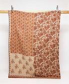 Elevate your bedding with our twin kantha quilt featuring a beautiful brown floral pattern, meticulously hand-stitched from 6 layers of vintage cotton saris. Versatile as both an oversized throw and a lightweight bed layer, this kantha quilt is a unique work of art, boasting a one-of-a-kind pattern you won’t find anywhere else. Pride in quality shines through in every stitch of this kantha blanket. Snuggle up in softness and experience unparalleled comfort.