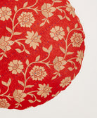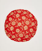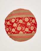 This one-of-a-kind round pillow features a bright cherry red and tan floral print. Each pillow is handcrafted in India from unique upcycled vintage saris and adorned with rows of hand embroidery by skilled women artisans for added texture. The removable down feather insert ensures easy cleaning and provides a luxuriously plush feel. Mix and match different styles to add a modern boho touch to your bedroom or living room.