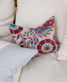 This handcrafted small pillow is created from upcycled vintage cotton saris. With a unique design on each side, it's simple to switch up your decor to match the season or your state of mind. Complete with delightful hand-stitched detailing and a soft down feather insert, this small lumbar pillow brings a special touch to any bed or sofa.