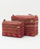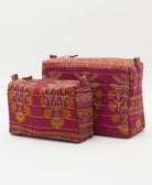 Expertly crafted from hand-selected vintage cotton saris and reinforced with durable canvas, this set of toiletry bags combines timeless charm with everyday functionality. Each set includes two coordinating sizes—one medium and one large—featuring rare, matching patterns due to the uniqueness of the vintage fabrics.