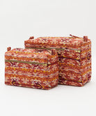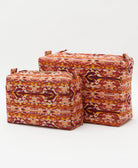 Expertly crafted from hand-selected vintage cotton saris and reinforced with durable canvas, this set of toiletry bags combines timeless charm with everyday functionality. Each set includes two coordinating sizes—one medium and one large—featuring rare, matching patterns due to the uniqueness of the vintage fabrics.