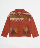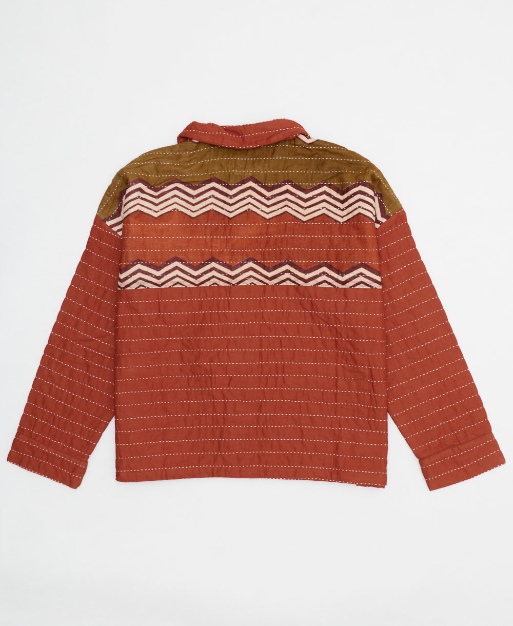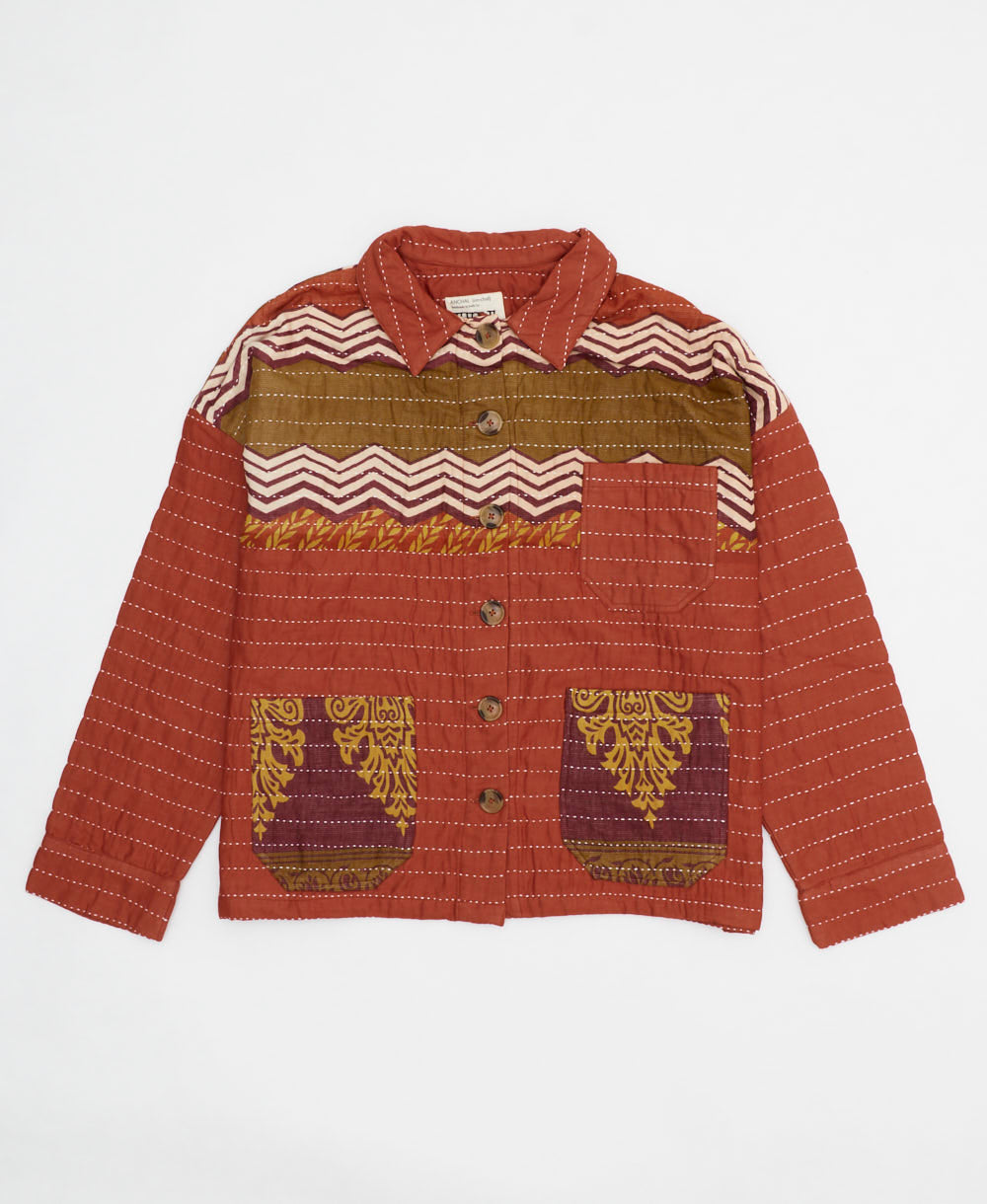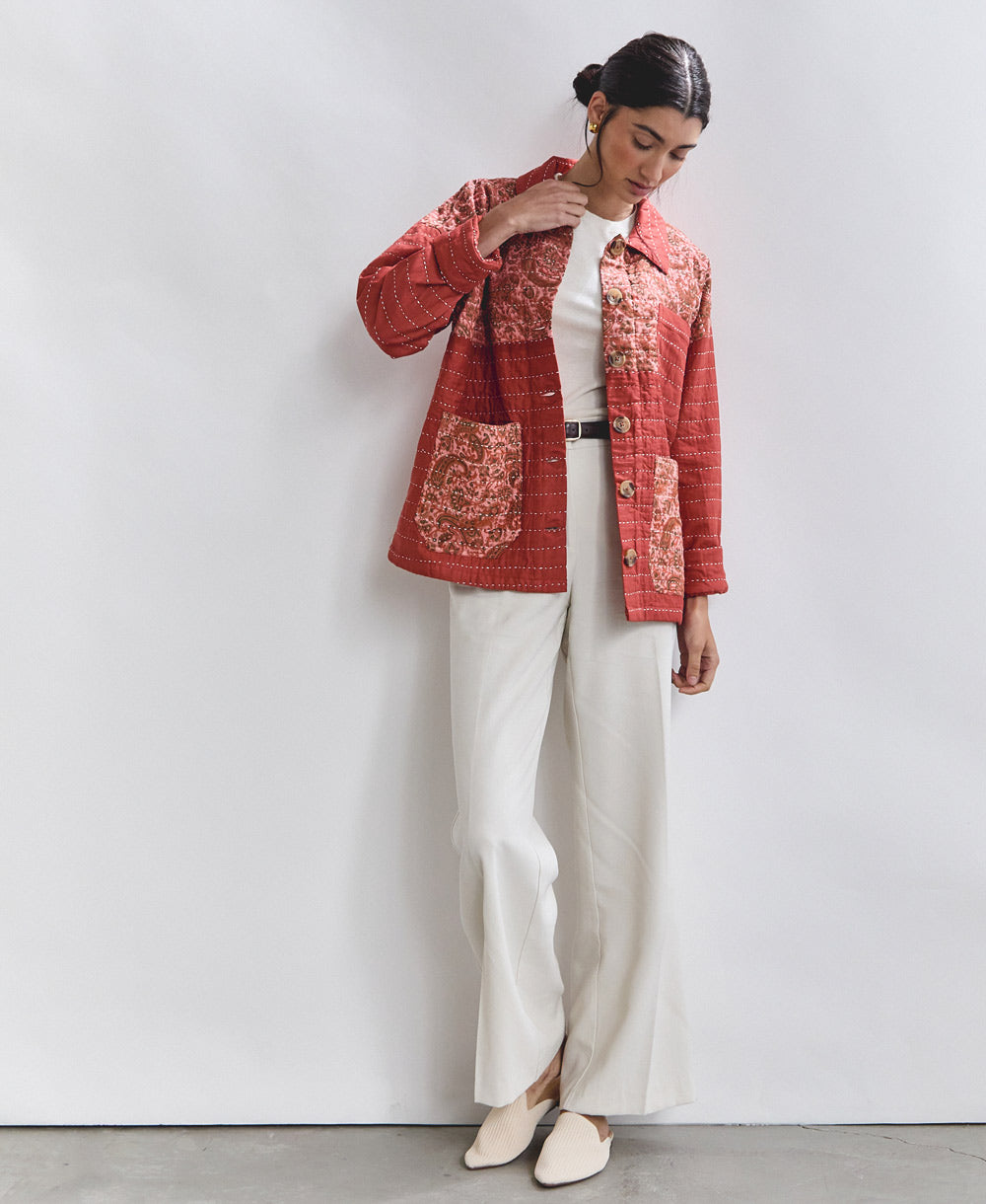 Meet your new favorite layer—the Quilted Chore Jacket in Rust! Made from 100% organic cotton and featuring one-of-a-kind vintage patchwork from repurposed cotton saris in a maroon and olive green chevron print, this jacket is like wearing a cozy piece of art. With three patch pockets, hand embroidery, and tortoise-shell colored buttons for a dash of charm, it’s got personality in every stitch. Lightweight but sneakily warm, this size large chore jacket is perfect for throwing over a tee or sweater when fall or spring breezes call for something extra. Each jacket is totally unique, just like you!