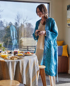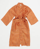 Upgrade your loungewear with this breezy silk robe made from repurposed vintage saris. Designed with boxy 3/4 length drop shoulder sleeves and an adjustable tie belt closure for a custom fit, this silk robe hits just below the knee for a luxurious aesthetic. Perfect for everyday lounging or getting ready for a night out, the silky fabric glides against your skin to keep you cool. There's even a loop sewn into the collar to easily hang it up after wearing.