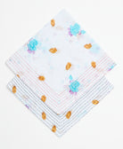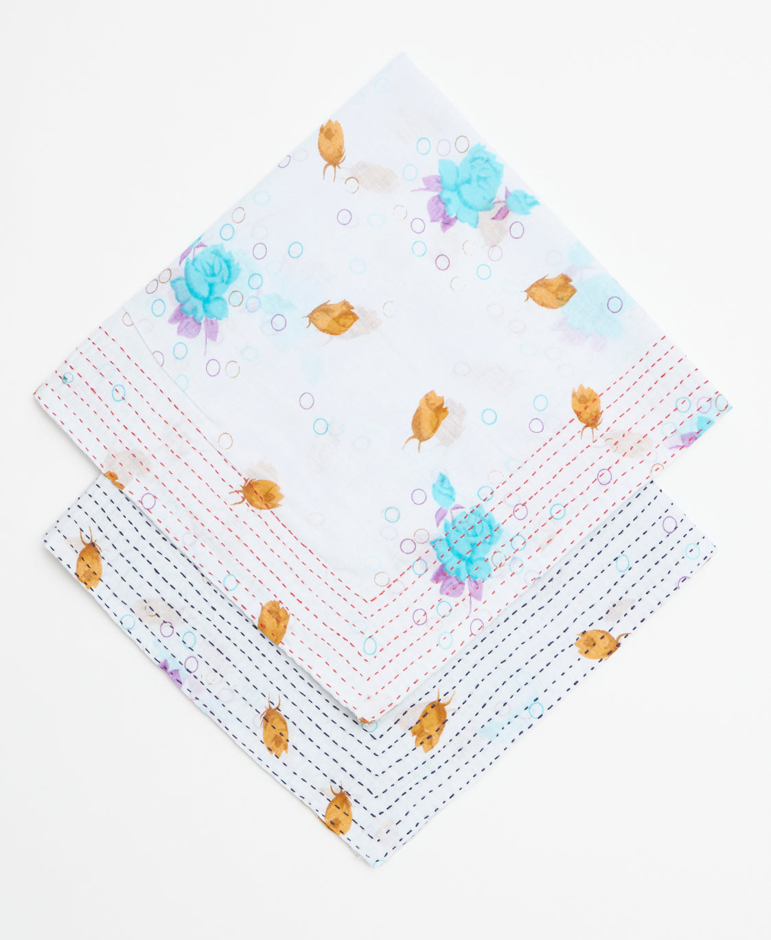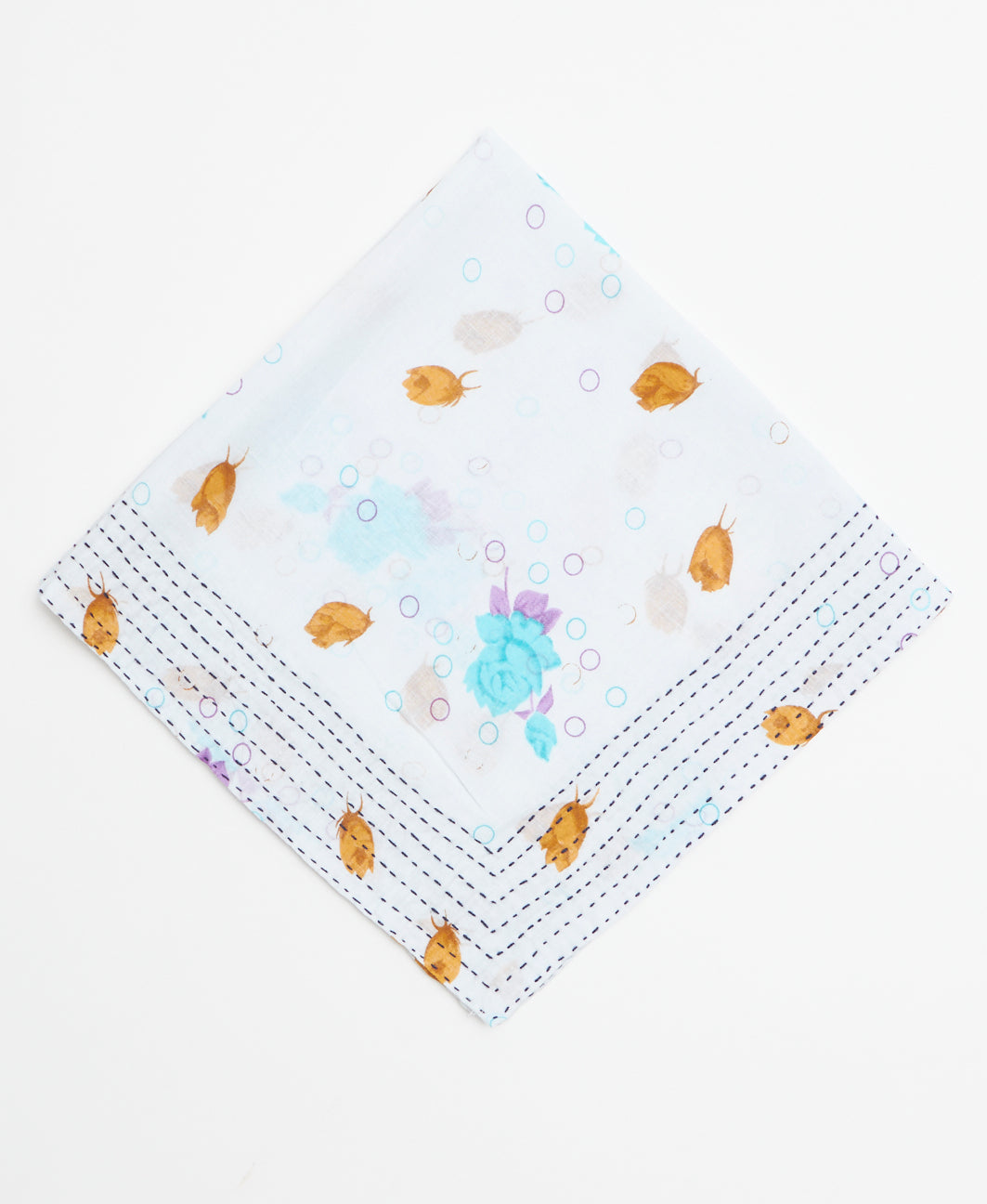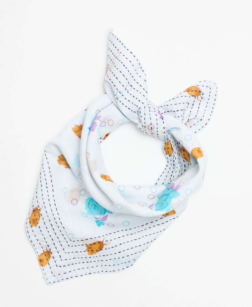 Add vintage flair to your look with our white cotton bandana in a geometric floral print! Made from upcycled cotton saris, each bandana scarf features a unique kantha embroidered edge. Use as a head wrap or neckerchief for a versatile and eco-friendly accessory.