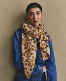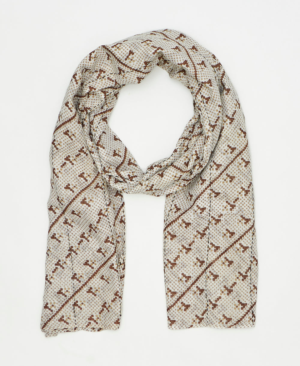 Add a pop of charm to your sustainable wardrobe with our cotton oversized scarf, featuring a brown abstract pattern. Each long scarf is one-of-a-kind, handcrafted from upcycled vintage cotton saris and adorned with delicate embroidery for added detail and texture. Perfect for those in-between seasons, this lightweight scarf can be wrapped around your neck to fend off chilly drafts or draped over your shoulders as a stylish shawl or beach wrap. Whether you're layering up for a brisk walk or adding a splash of color to your outfit, this playful accessory is your new go-to for versatile, eco-friendly fashion.