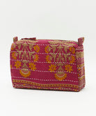 Experience the joy of packing for your trip with our quirky and fun medium toiletry bag, made from upcycled vintage cotton saris. The canvas-lined interior provides structure and the exterior zip pocket offers extra storage. This spacious bag is perfect for storing makeup and makeup brushes or essential toiletries. Don't let its small size fool you, it tucks away easily in a duffle bag or suitcase for convenient travel. Complete your travel bag set with one of our large toiletry bags in a coordinating one-of-a-kind print for a fun and mismatched look.