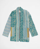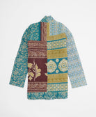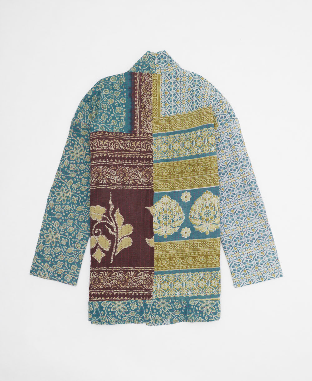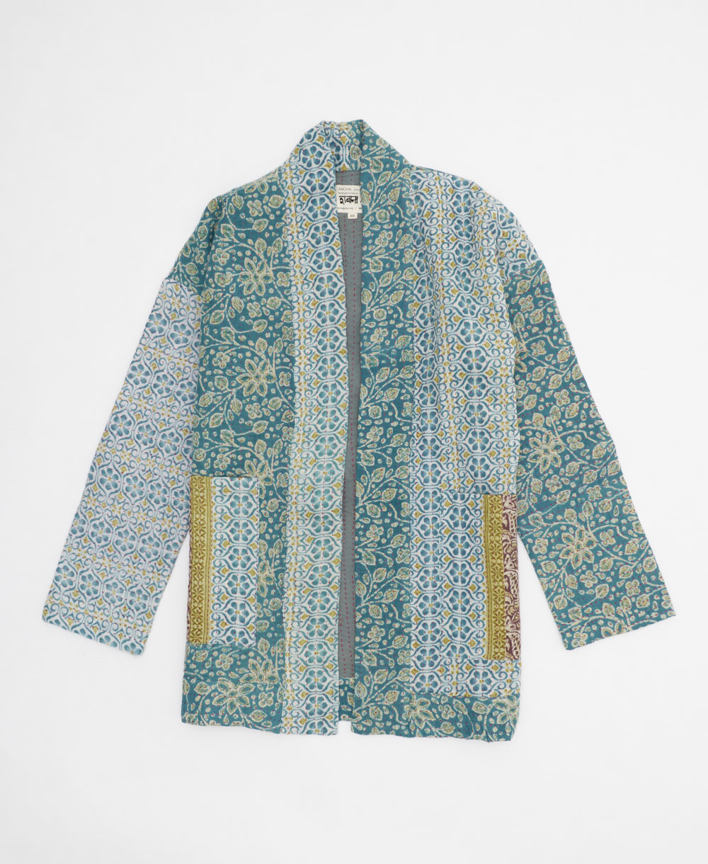 Upgrade your wardrobe with this one-of-a-kind open-front quilted jacket, adorned with a sky blue and teal floral print, two large front pockets, and a cardigan jacket design with drop shoulder sleeves. Meticulously crafted and transformed from layers of vintage cotton saris, this unique jacket seamlessly blends the coziness of your favorite quilt with the charm of wearable art.