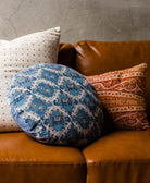 This one-of-a-kind round pillow is handcrafted in India from unique upcycled vintage saris and adorned with rows of hand embroidery by skilled women artisans for added texture. The removable down feather insert ensures easy cleaning and provides a luxuriously plush feel. Mix and match different styles to add a modern boho touch to your bedroom or living room.