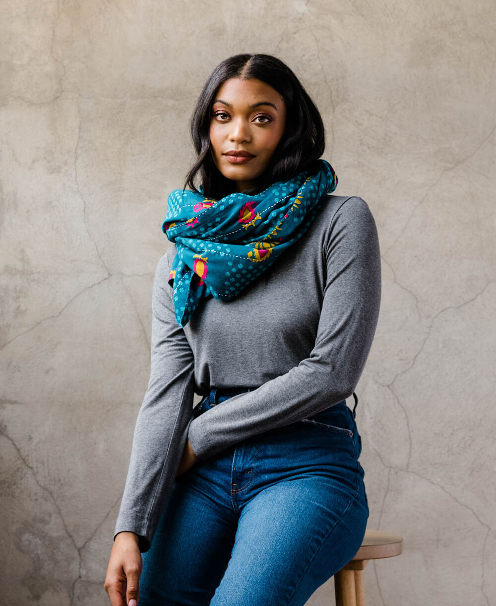 Wrap yourself in elegance with our long cotton scarf, a versatile accessory that can be tied or draped in endless ways. Adorned with rows of tiny hand-stitched embroidery, this scarf is perfect for beating the chill while bundling up in style. Whether you wear it as a colorful fashion statement, an oversized scarf, or even as a shawl, this piece adds a touch of sophistication to any outfit. Shop the silhouette in two fabrics—100% organic cotton or one of our unique, one-of-a-kind long scarves, ensuring no two are alike.