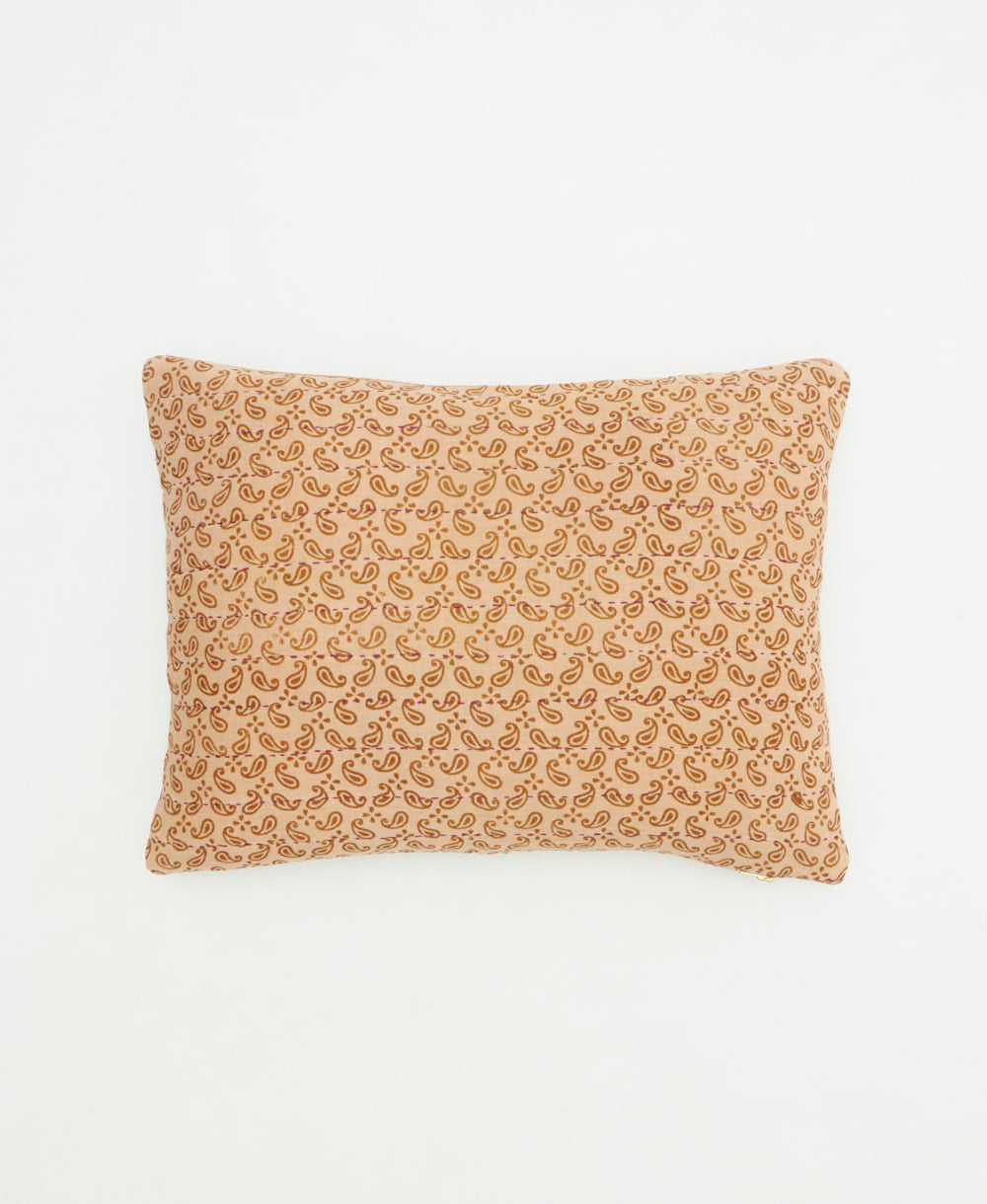 This handcrafted small pillow was created from upcycled vintage cotton saris. With a unique design on each side, it's simple to switch up your decor to match the season or your state of mind. Complete with delightful hand-stitched detailing and a soft down feather insert, this small lumbar pillow brings a special touch to any bed or sofa.