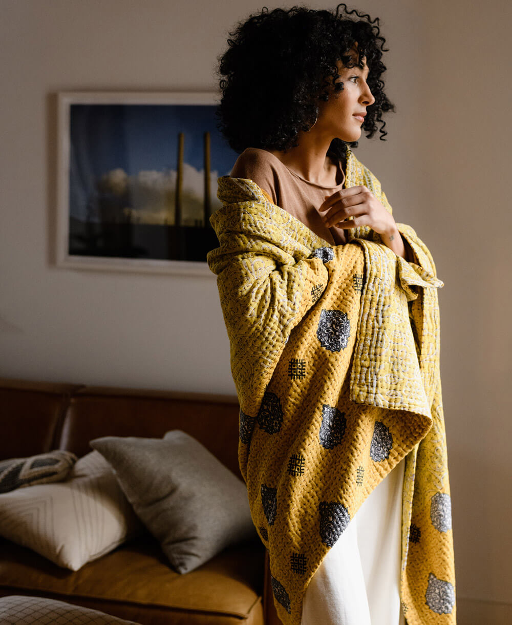 Kantha blankets are cherished Indian quilts, known for their eco-friendly nature and vibrant, unique patterns. This centuries-old craft turns patchwork cloth into stunning works of art, made from repurposed rags. Our Kantha blankets stand out for their amazing craftsmanship and quality. No two are alike, and each quilt is signed by the artisan, adding a special, personal touch to your unique piece.