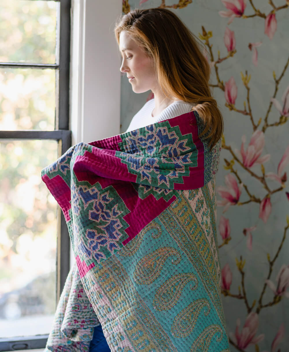 Kantha blankets are cherished Indian quilts, known for their eco-friendly nature and vibrant, unique patterns. This centuries-old craft turns patchwork cloth into stunning works of art, made from repurposed rags. Our Kantha blankets stand out for their amazing craftsmanship and quality. No two are alike, and each quilt is signed by the artisan, adding a special, personal touch to your unique piece.