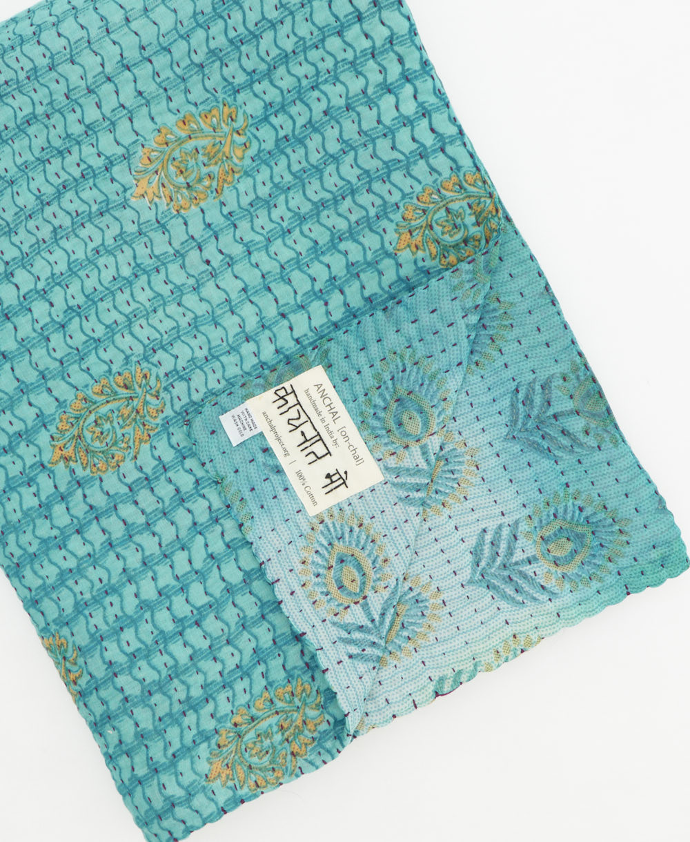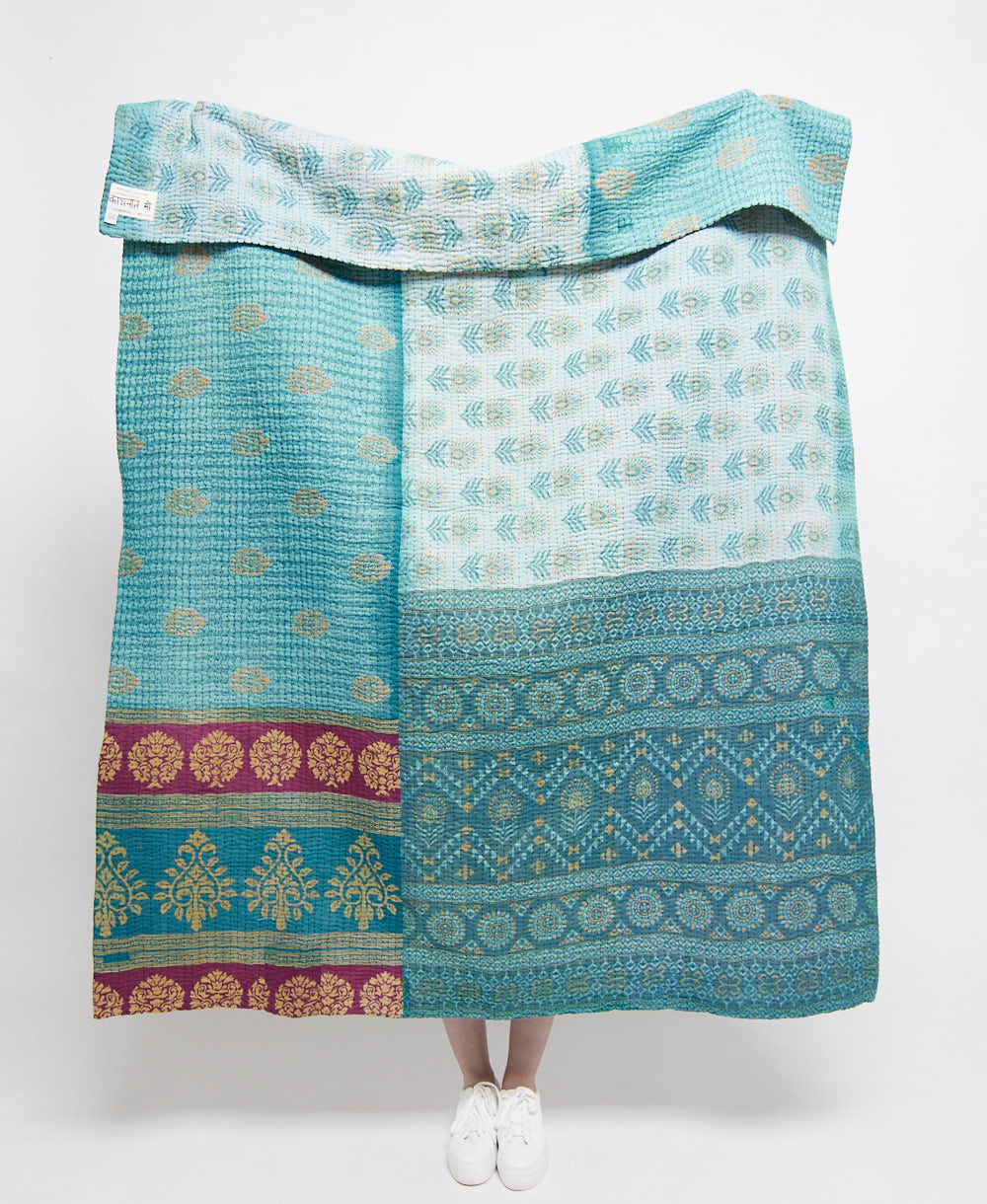 Wrap yourself in cozy charm and comfort with this beautiful Kantha quilt. Each quilt is handmade with care and skill, featuring neat rows of straight stitches that bind together six layers of vintage cotton saris—light, muslin-like fabrics that feel incredibly soft to the touch.