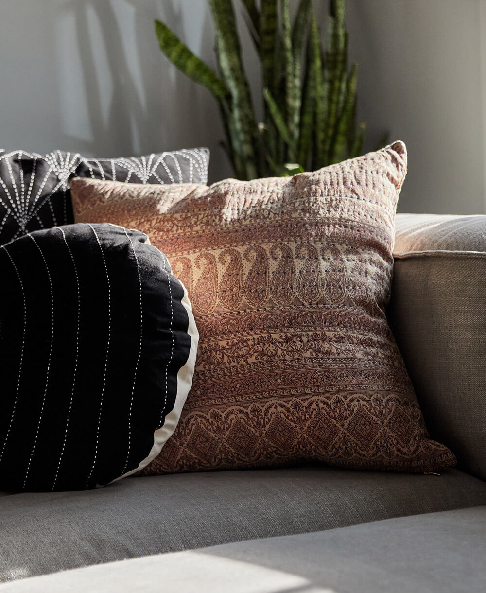 This handcrafted throw pillow was created from upcycled vintage cotton saris. With a unique design on each side, it's simple to switch up your decor to match the season or your state of mind. Complete with delightful hand-stitched detailing and a soft down feather insert, this colorful throw pillow brings a special touch to any bed or sofa.