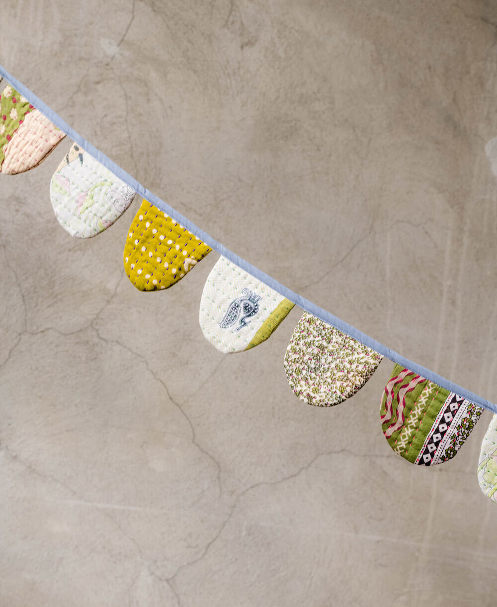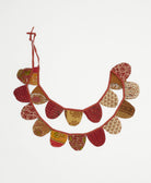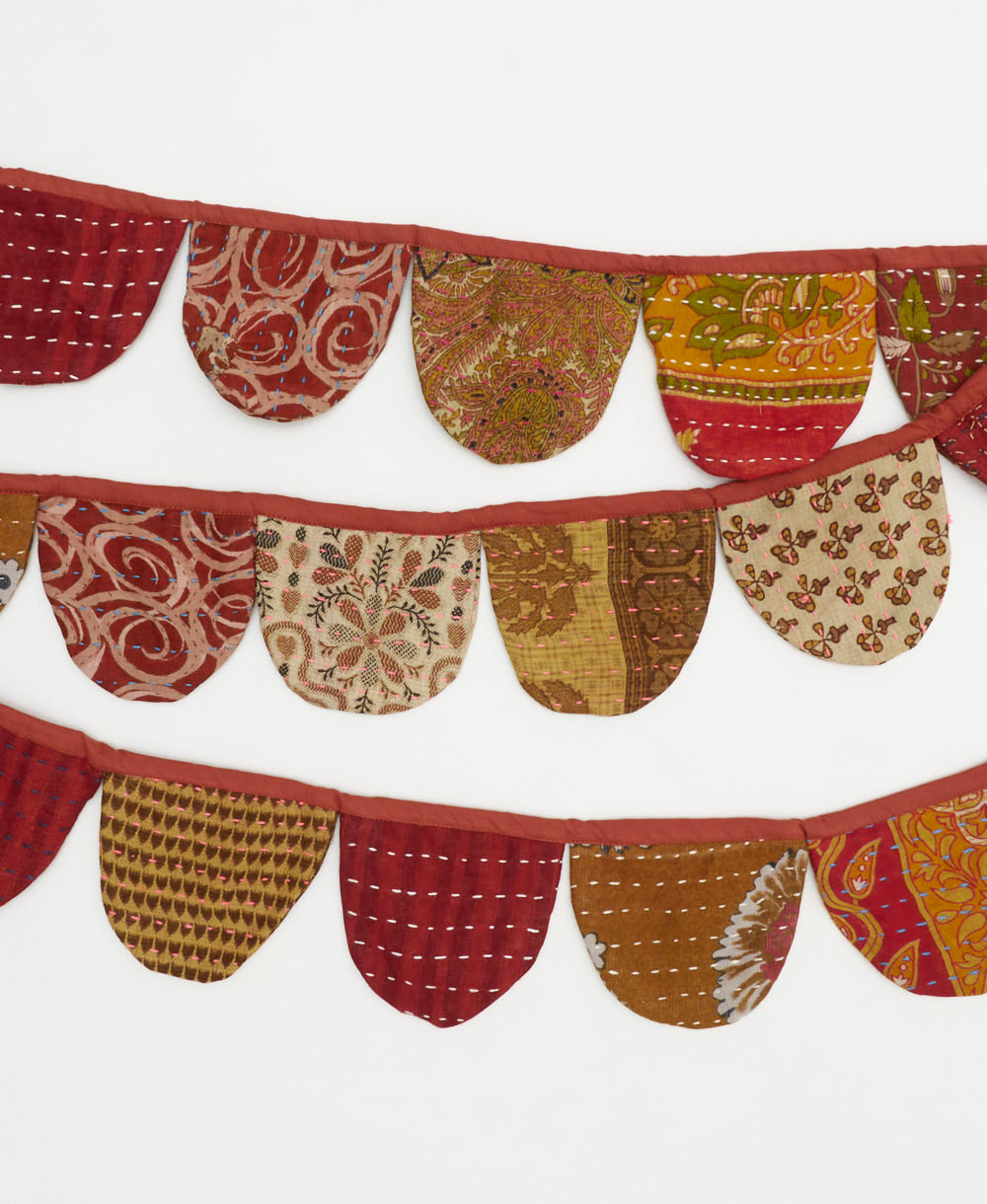 This unique scallop banner is crafted from repurposed vintage cotton saris, utilizing excess materials to provide an eco-friendly option for elevating your upcoming event or gathering. Adding this fabric garland will infuse any area with a pop of color, and each piece is truly unique. This reusable party decoration can be used for years to come, whether hung over a mantel, in a doorway, or on a wall to create a lively celebratory atmosphere.