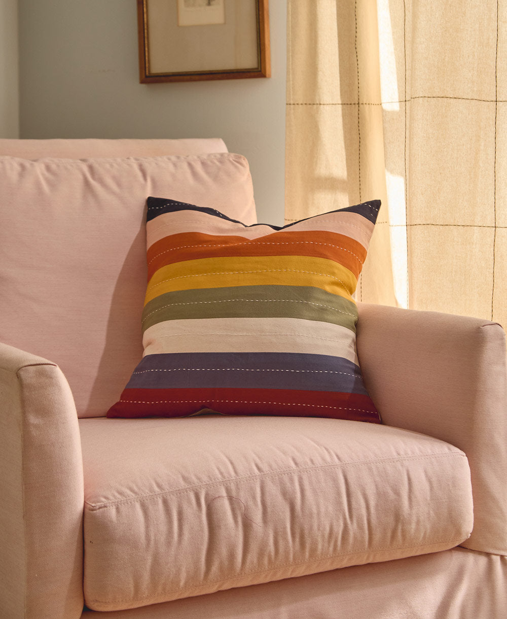 Add a playful pop of color to your space with this rainbow square pillow. Bursting with vibrant, multi-colored stripes and delicate rows of kantha stitching, this throw pillow is as fun as it is functional. The removable cover makes cleaning a breeze, while the plush down feather insert promises cloud-like comfort. Whether you mix and match it with our other rainbow pillows or pair it with our charming cross-stitch throw pillows, this piece is sure to brighten up any corner of your home!