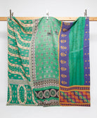 This queen kantha quilt is expertly hand-stitched from start to finish using layers of the highest quality vintage cotton saris. Every stitch reflects our dedication to craftsmanship, ensuring each kantha blanket is not only a functional item but also a work of art. With each quilt being completely one-of-a-kind and unique in pattern, it becomes a statement piece in any room it graces. The signature of the artisan maker on the tag also adds a personal connection, allowing you to appreciate the hands that created it.