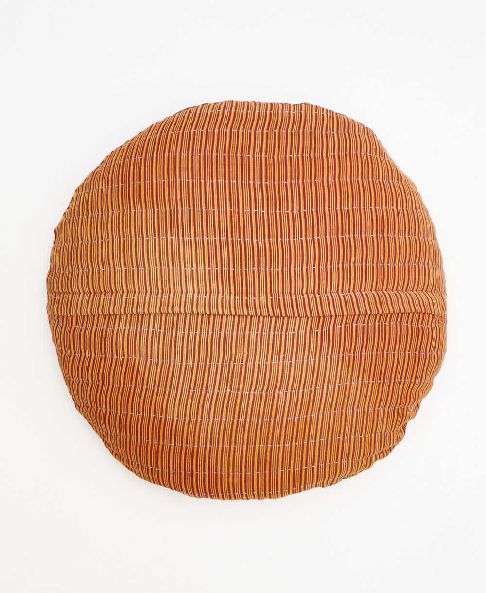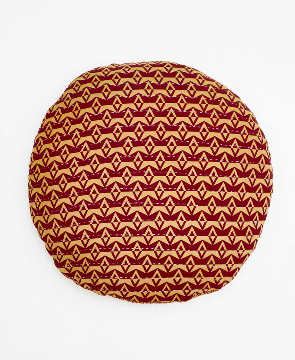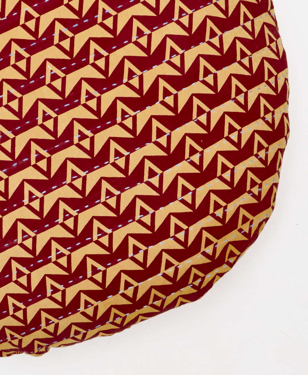 This one-of-a-kind round pillow features a tan and burgundy diamond print. Each pillow is handcrafted in India from unique upcycled vintage saris and adorned with rows of hand embroidery by skilled women artisans for added texture. The removable down feather insert ensures easy cleaning and provides a luxuriously plush feel. Mix and match different styles to add a modern boho touch to your bedroom or living room.