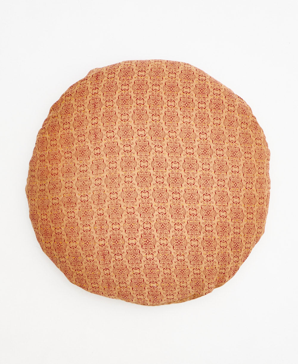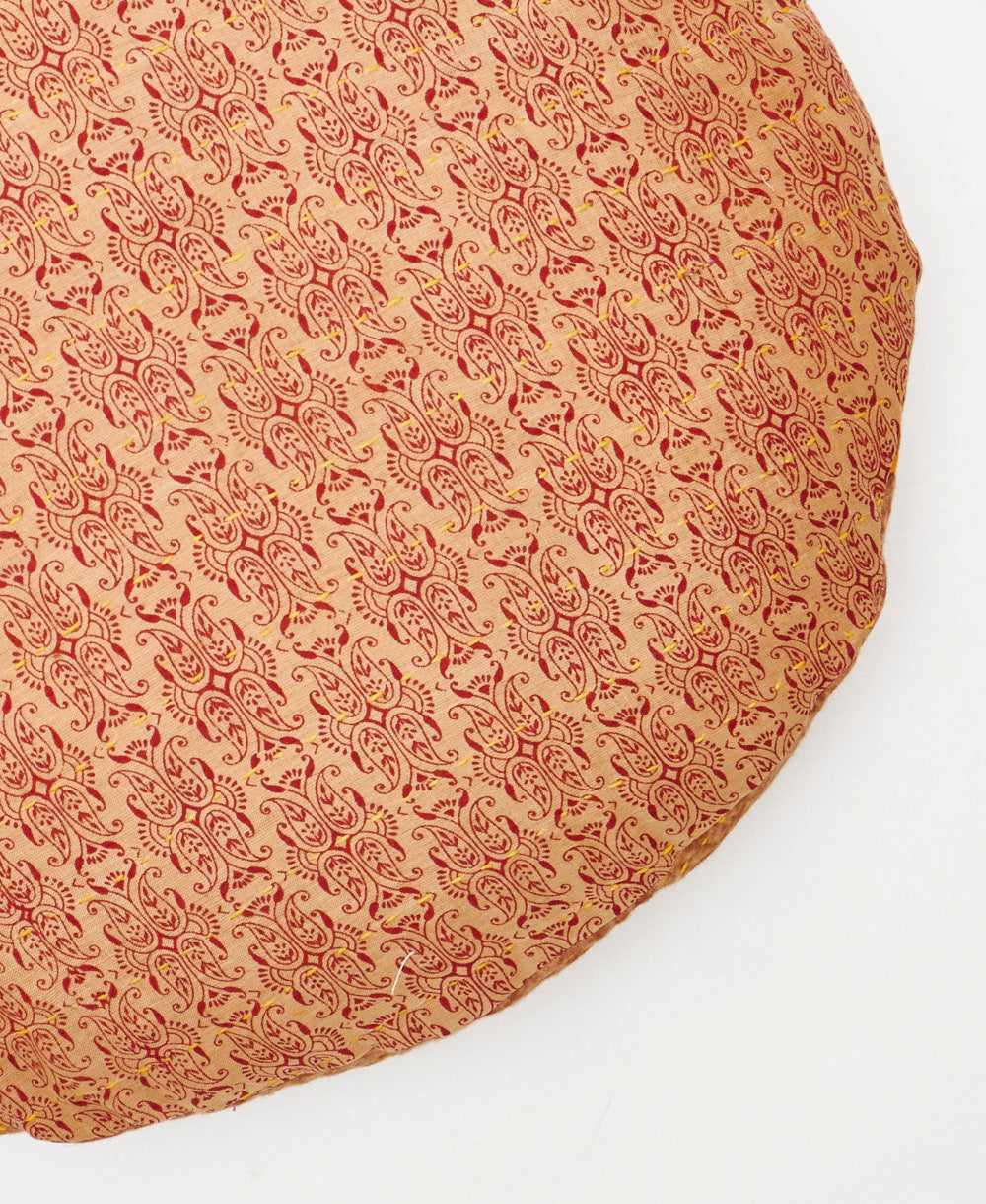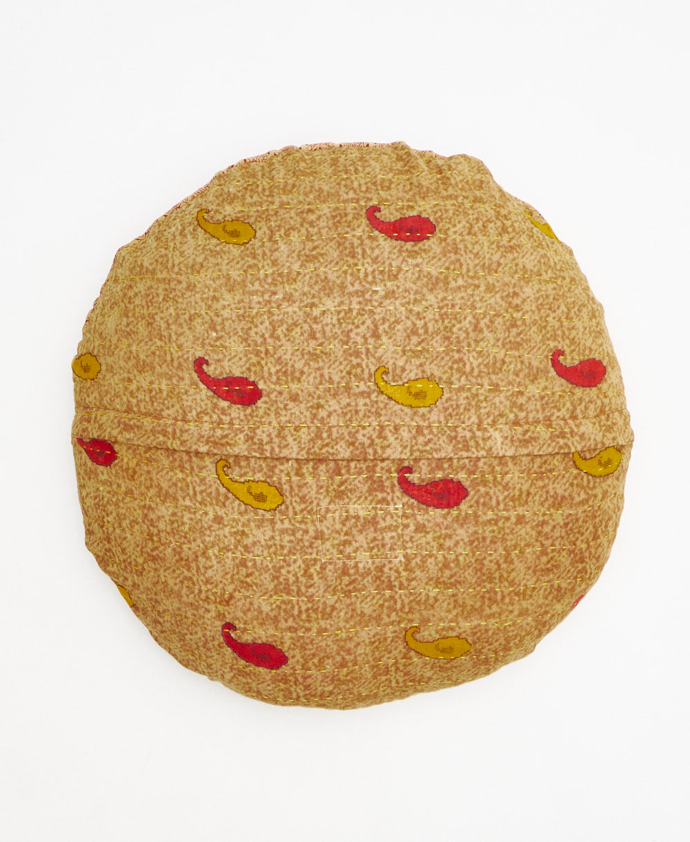 This one-of-a-kind round pillow features a light tan and red paisley print. Each pillow is handcrafted in India from unique upcycled vintage saris and adorned with rows of hand embroidery by skilled women artisans for added texture. The removable down feather insert ensures easy cleaning and provides a luxuriously plush feel. Mix and match different styles to add a modern boho touch to your bedroom or living room.