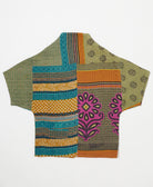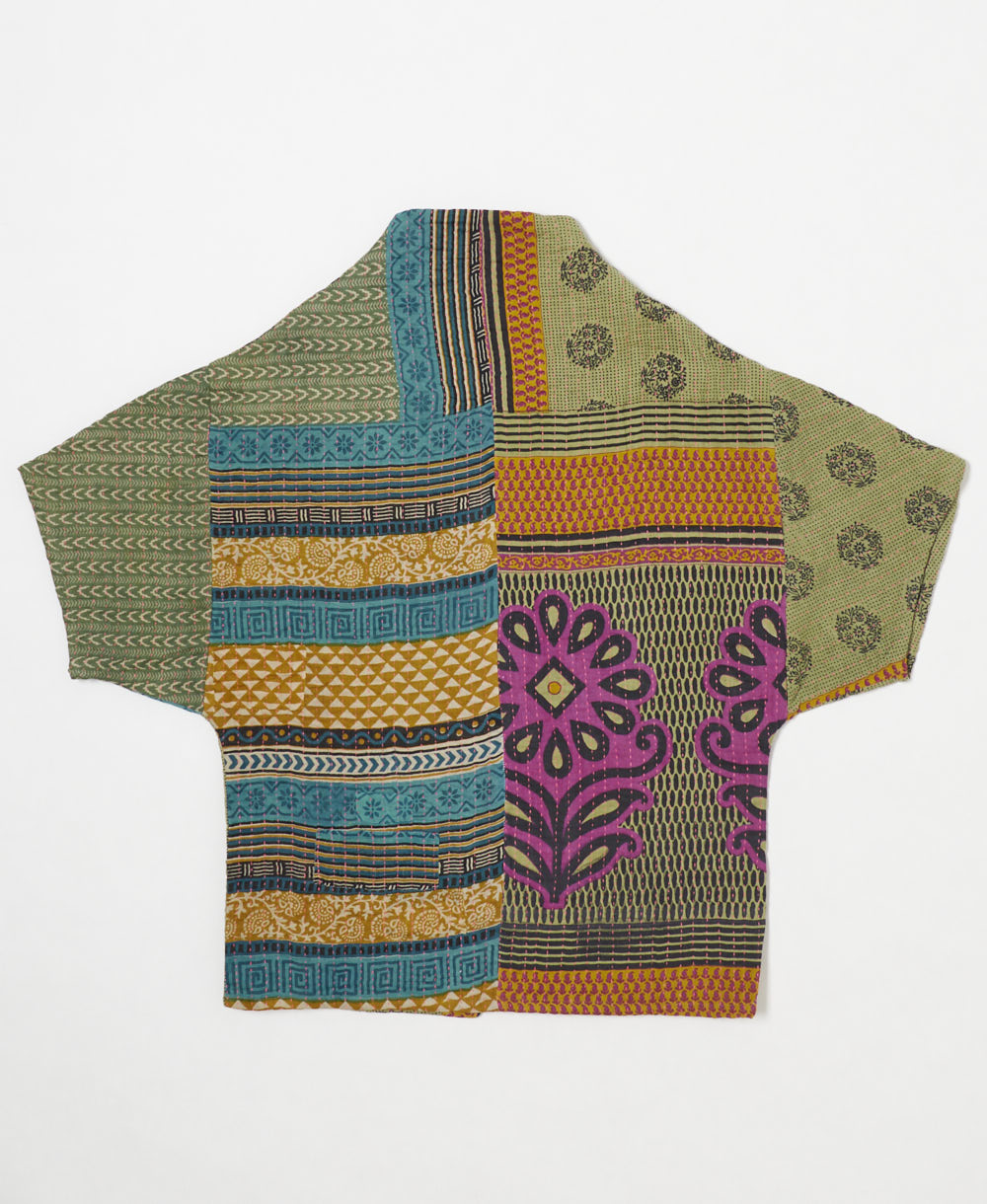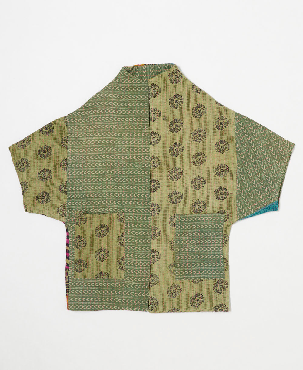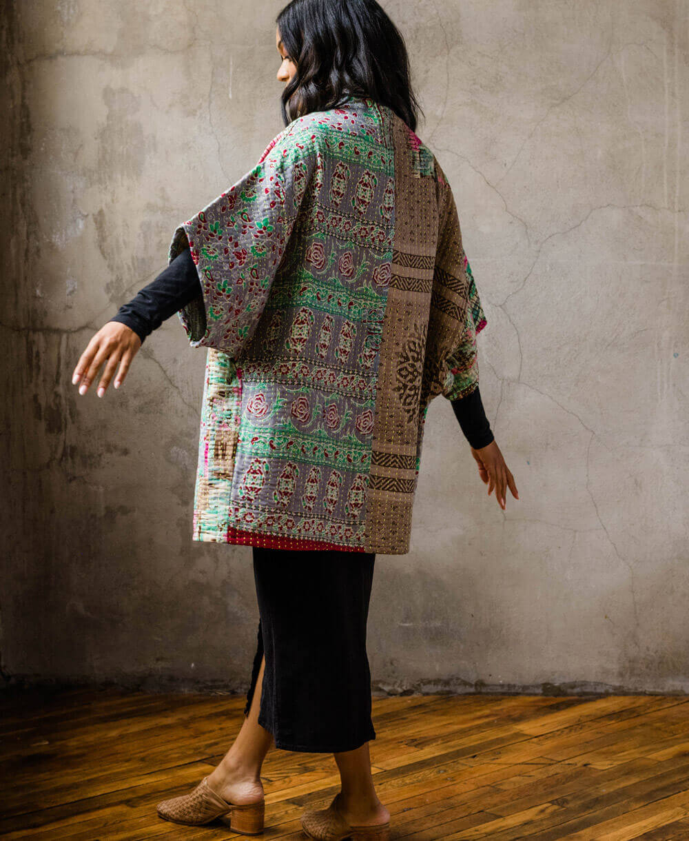 This sage green geometric cocoon quilted jacket is truly unique. No two are exactly alike, making it a one-of-a-kind wearable art piece. Constructed from 6 layers of upcycled cotton saris with all-over hand-stitching, this long quilted jacket will make you feel just like you’re cuddling up with your favorite quilt. Featuring two large front patch pockets for convenience and a modern cocoon neckline, this jacket will be one you reach for again and again. Layer it over a t-shirt or your favorite sweater for an effortless feel.