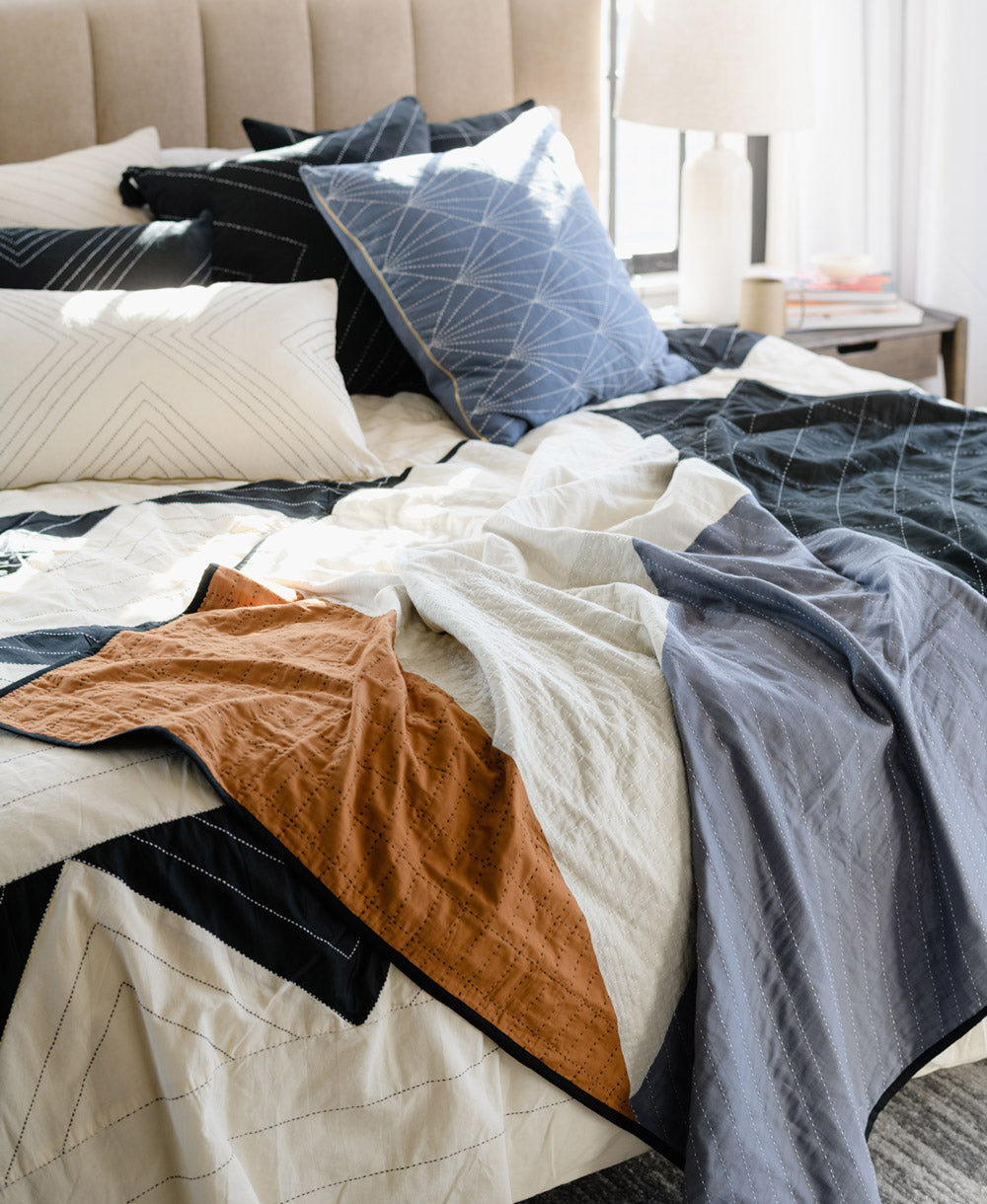 Introducing the Naari Patchwork Quilt, where timeless kantha quilting meets modern geometric flair. Crafted by talented women artisans from 100% organic cotton, this lightweight reversible quilt features vibrant embroidery patterns and playful paneling, creating striking intersections of color and texture. Flip it over for a solid charcoal base with fun bone stitch detailing, perfect for a sleek look. Pair it with coordinating pillows or explore the design in bedding-sized quilts to add a bold statement to your space!