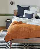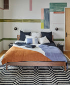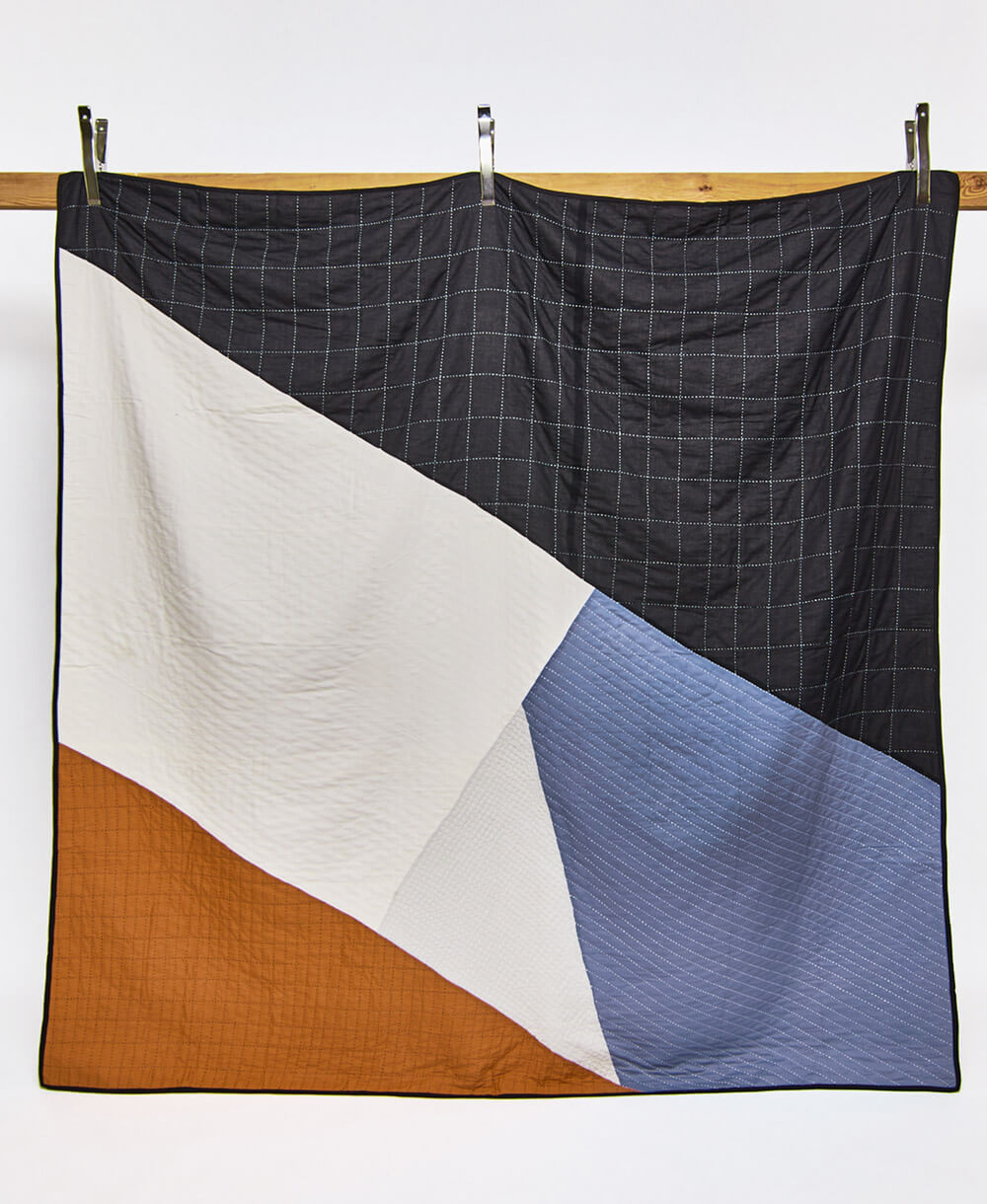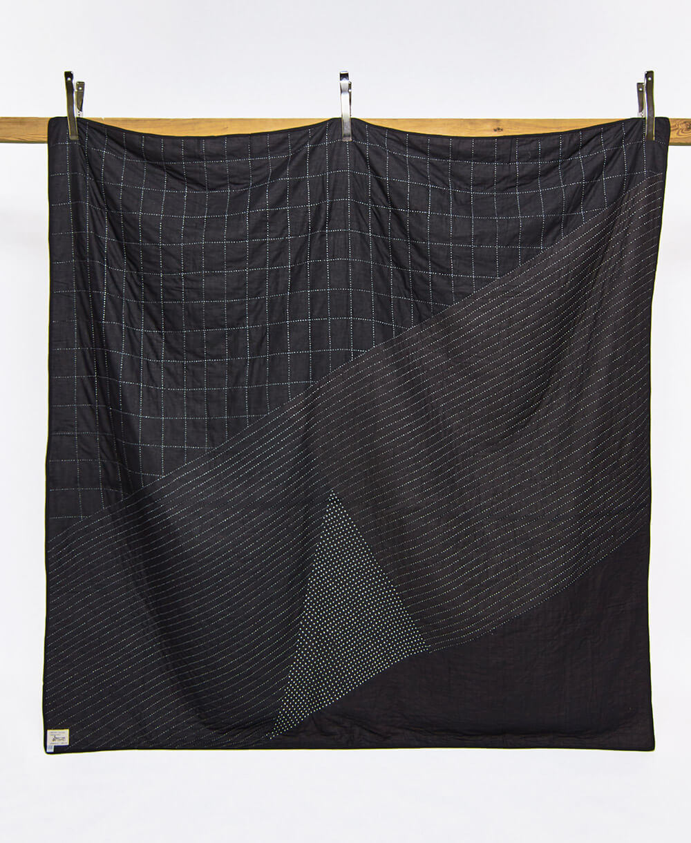 Meet the Naari Patchwork Quilt Bedding, where timeless kantha quilting meets modern geometric design. Crafted by women artisans from 100% organic cotton, this reversible modern quilt showcases intricate embroidery patterns and paneling, resulting in striking intersections of color and texture. Flip it over to reveal a solid charcoal base with bone stitch detailing for a sleek, monochromatic aesthetic. Elevate your space with this sustainably made heirloom textile art.