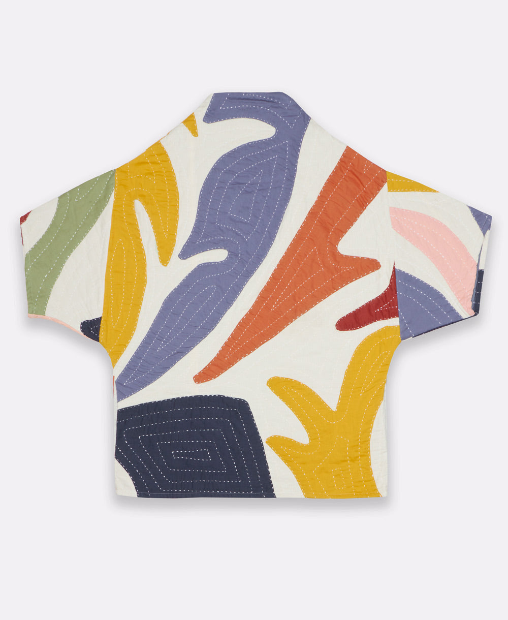 This artisan-crafted Petal Cocoon Quilted Jacket features a playful combination of new appliqué techniques and organic fluid patchwork, resulting in a whimsical and fun design. Boasting 23 appliqué petals and 6 layers of organic cotton, this quilted floral jacket is meticulously hand-stitched for over 20 hours. With playful and colorful petal-shaped details, it will turn heads and make you stand out in any room. Plus, the relaxed cocoon silhouette and 2 hidden side pockets add a touch of convenience to this already unique piece.