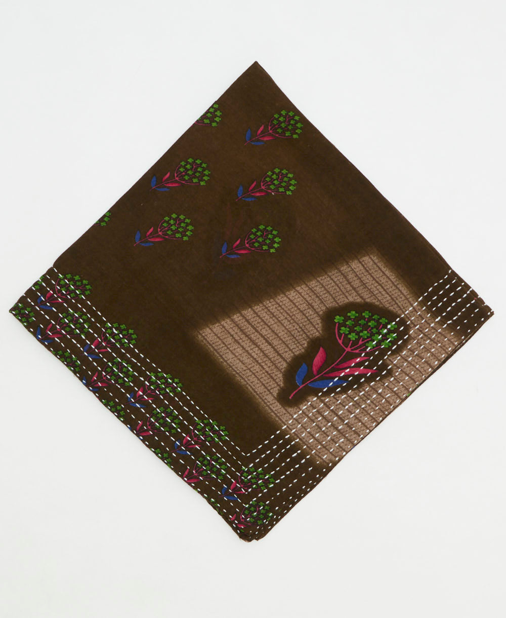 Add vintage flair to your look with our cotton bandana! Made from upcycled cotton saris, each bandana scarf features a unique kantha embroidered edge. Use as a head wrap or neckerchief for a versatile and eco-friendly accessory.
