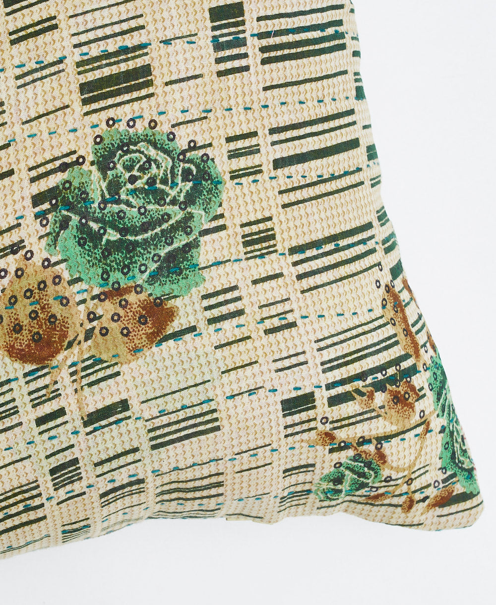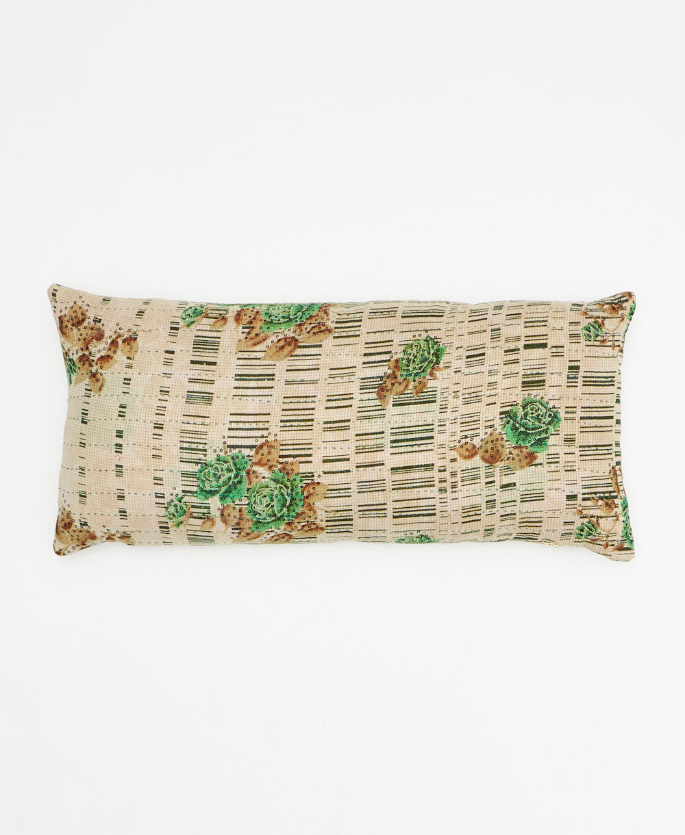 The front of this handcrafted grey lumbar pillow features an emerald green rose print created from upcycled vintage cotton saris. With a unique design on each side, it's simple to switch up your decor to match the season or your state of mind. Complete with delightful hand-stitched detailing and a soft down feather insert, this lumbar throw pillow brings a special touch to any bed or sofa.
