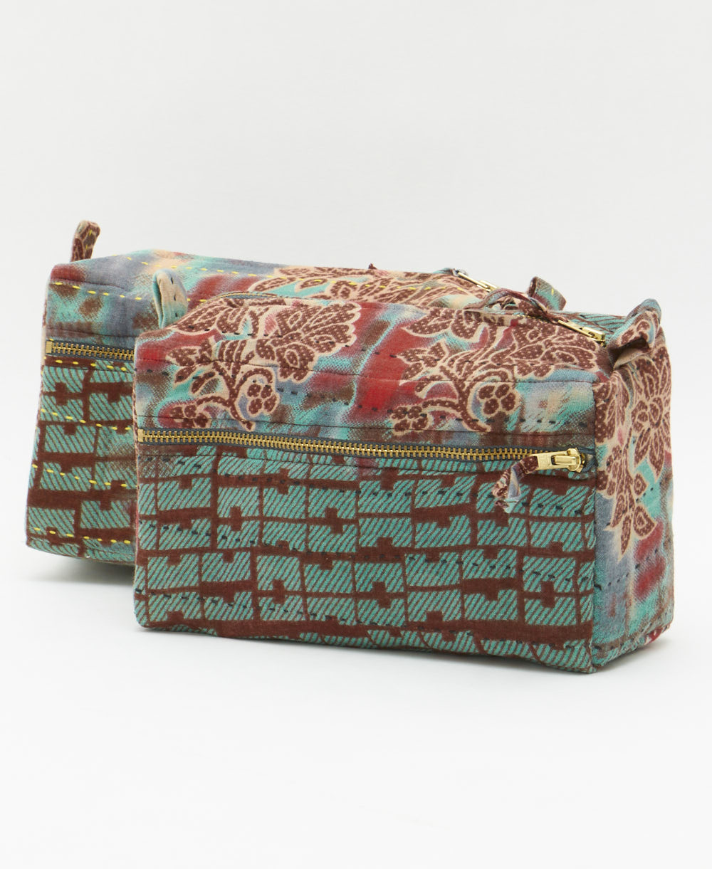 Experience the joy of packing for your trip with our quirky and fun medium toiletry bag, made from upcycled vintage cotton saris. The canvas-lined interior provides structure and the exterior zip pocket offers extra storage. This spacious bag is perfect for storing makeup and makeup brushes or essential toiletries. Don't let its small size fool you, it tucks away easily in a duffle bag or suitcase for convenient travel. Complete your travel bag set with one of our large toiletry bags in a coordinating one-of-a-kind print for a fun and mismatched look.