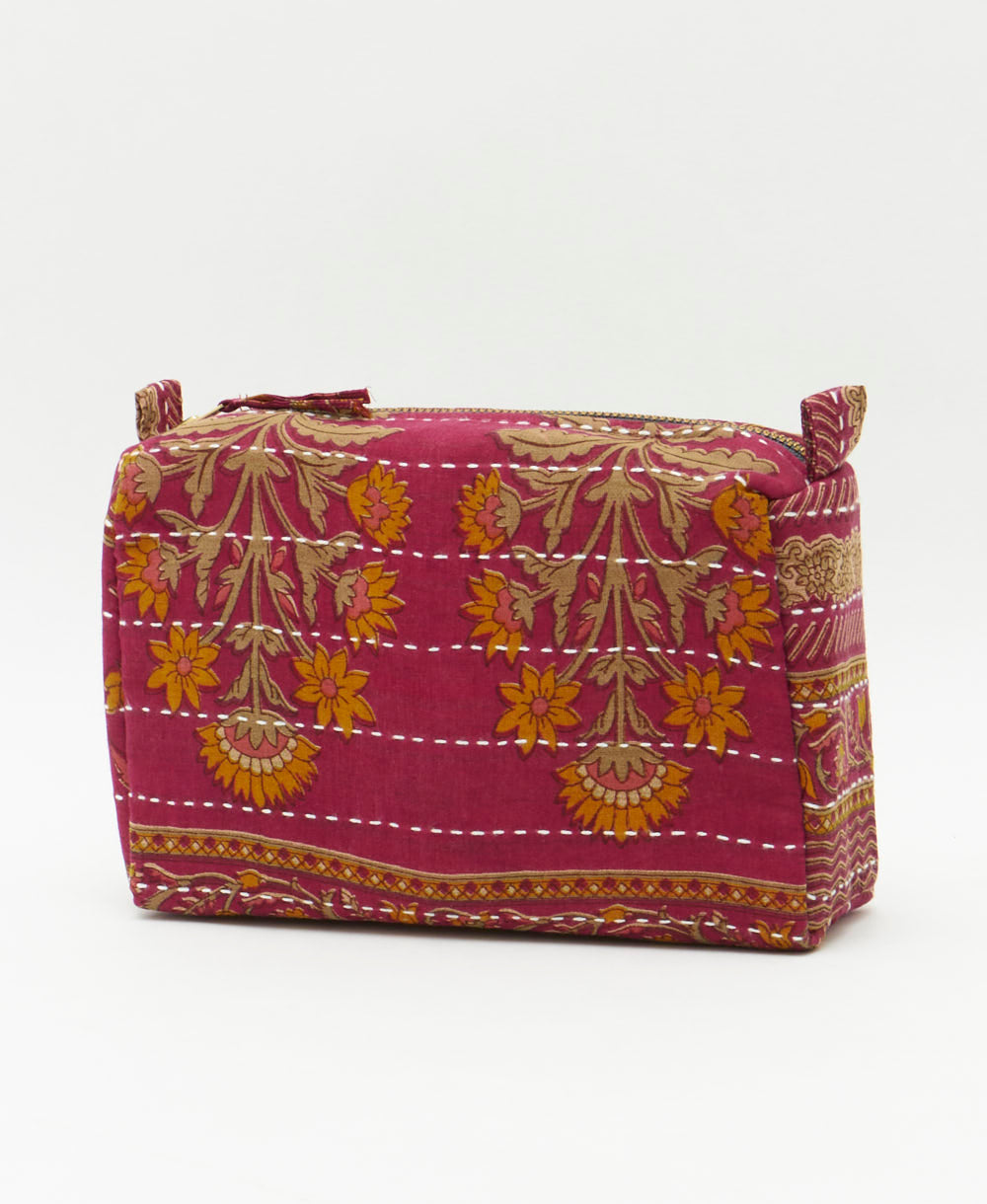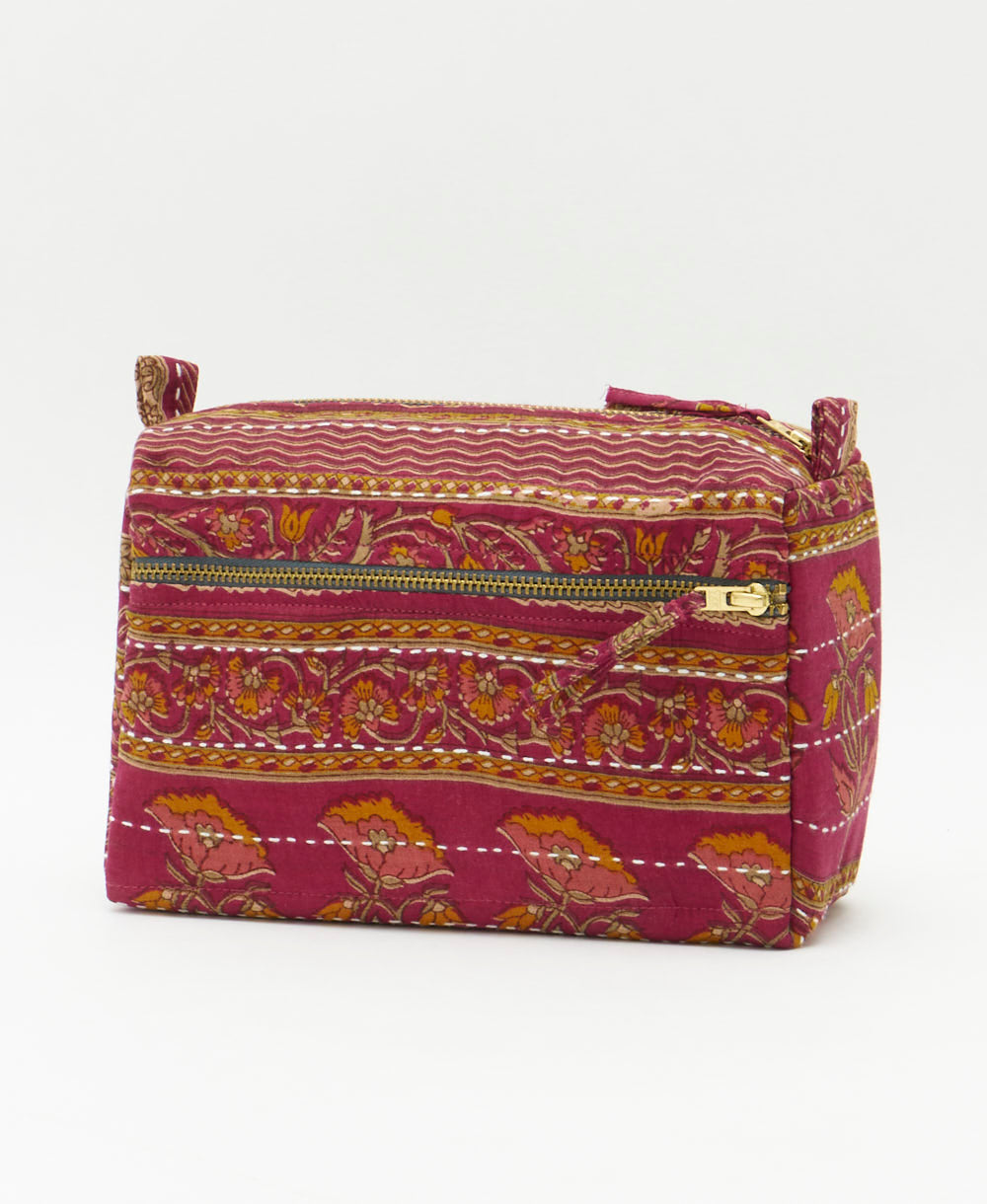 Experience the joy of packing for your trip with our quirky and fun medium toiletry bag, made from upcycled vintage cotton saris. The canvas-lined interior provides structure and the exterior zip pocket offers extra storage. This spacious bag is perfect for storing makeup and makeup brushes or essential toiletries. Don't let its small size fool you, it tucks away easily in a duffle bag or suitcase for convenient travel. Complete your travel bag set with one of our large toiletry bags in a coordinating one-of-a-kind print for a fun and mismatched look.
