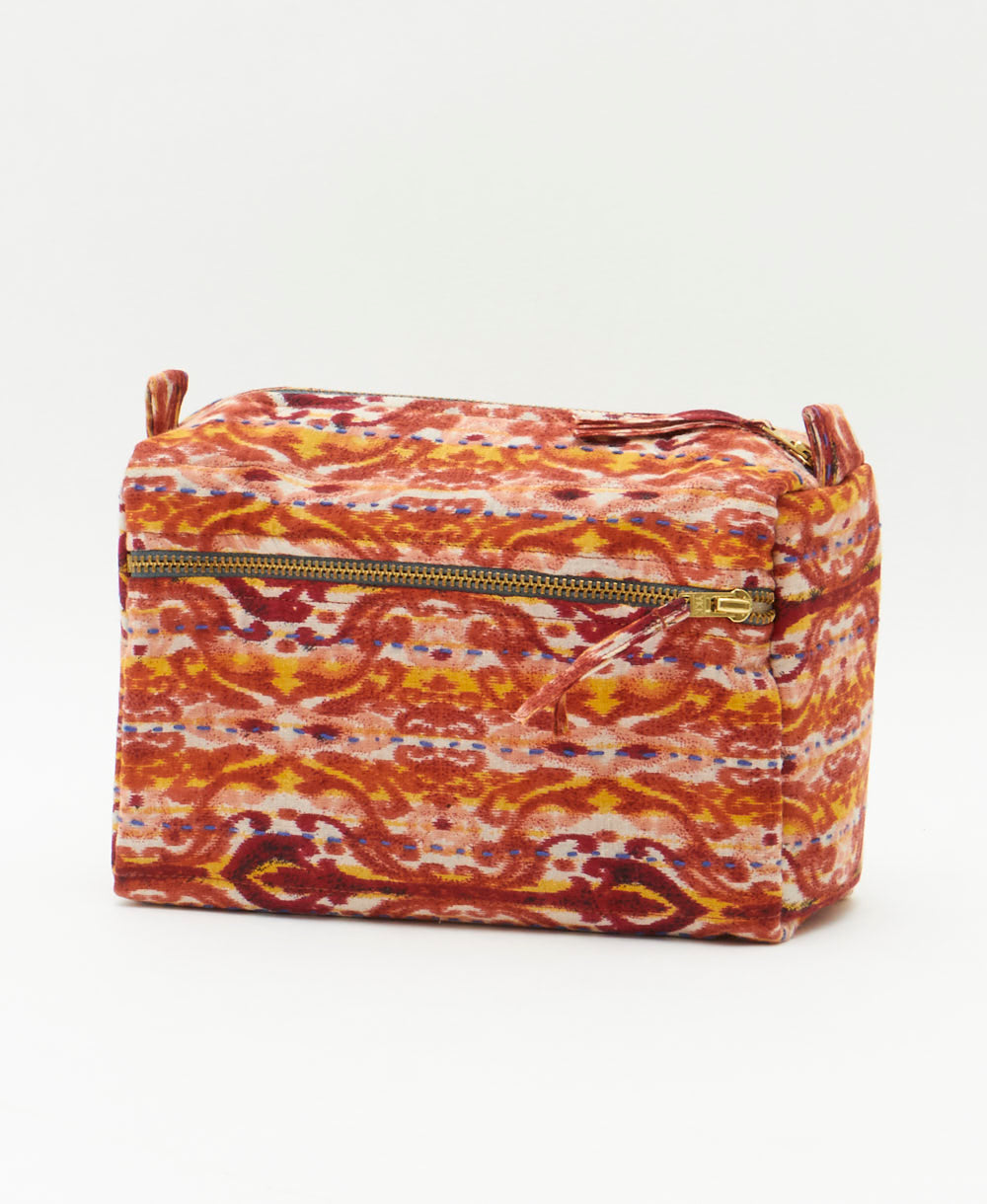 Experience the joy of packing for your trip with our quirky and fun medium toiletry bag, made from upcycled vintage cotton saris. The canvas-lined interior provides structure and the exterior zip pocket offers extra storage. This spacious bag is perfect for storing makeup and makeup brushes or essential toiletries. Don't let its small size fool you, it tucks away easily in a duffle bag or suitcase for convenient travel. Complete your travel bag set with one of our large toiletry bags in a coordinating one-of-a-kind print for a fun and mismatched look.