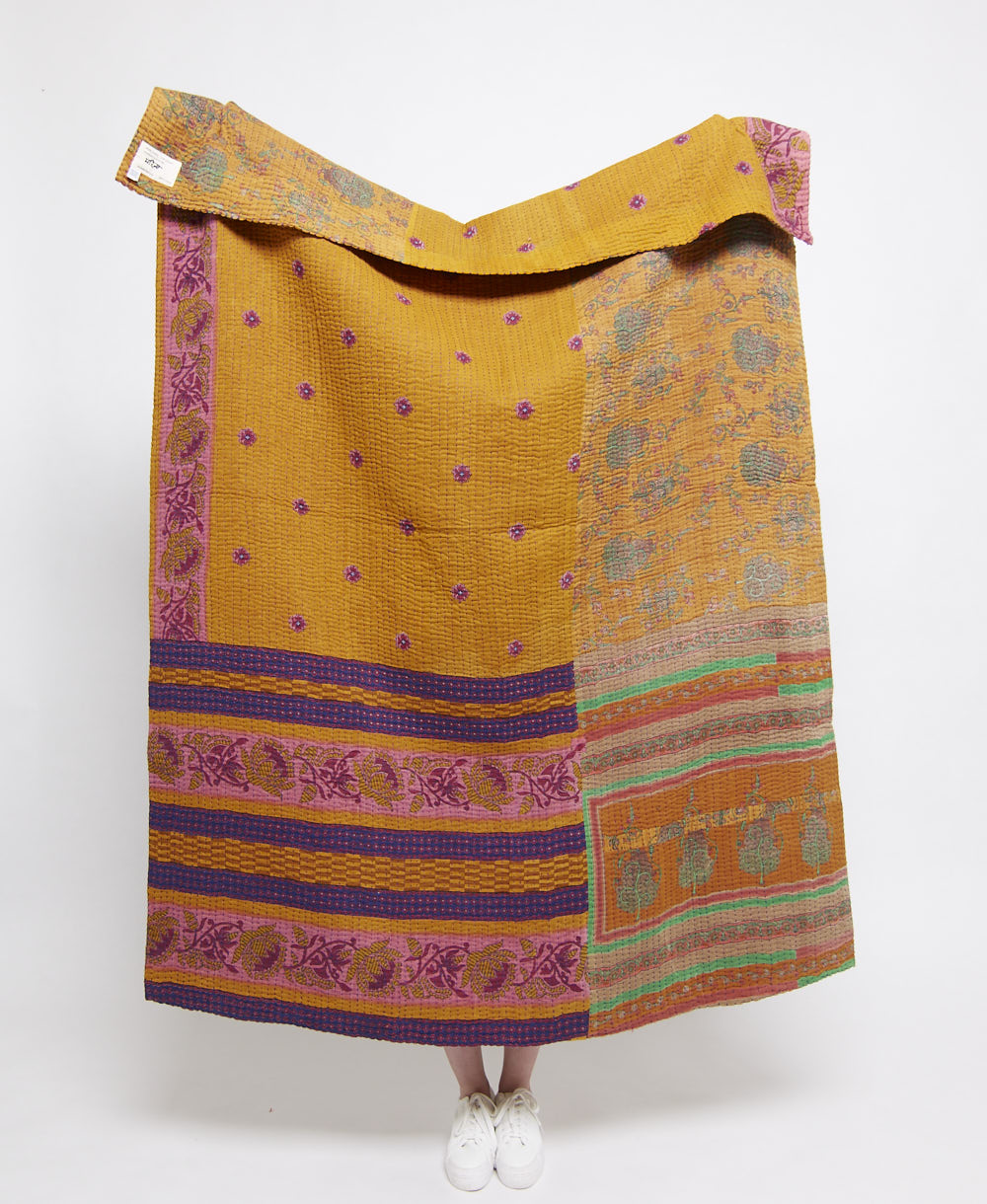 Wrap yourself in cozy charm and comfort with this beautiful Kantha quilt. Each quilt is handmade with care and skill, featuring neat rows of straight stitches that bind together six layers of vintage cotton saris—light, muslin-like fabrics that feel incredibly soft to the touch.