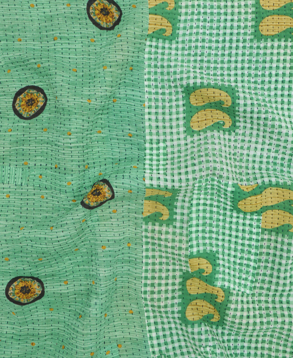 Wrap yourself in cozy charm and comfort with this beautiful Kantha quilt. Each quilt is handmade with care and skill, featuring neat rows of straight stitches that bind together six layers of vintage cotton saris—light, muslin-like fabrics that feel incredibly soft to the touch.