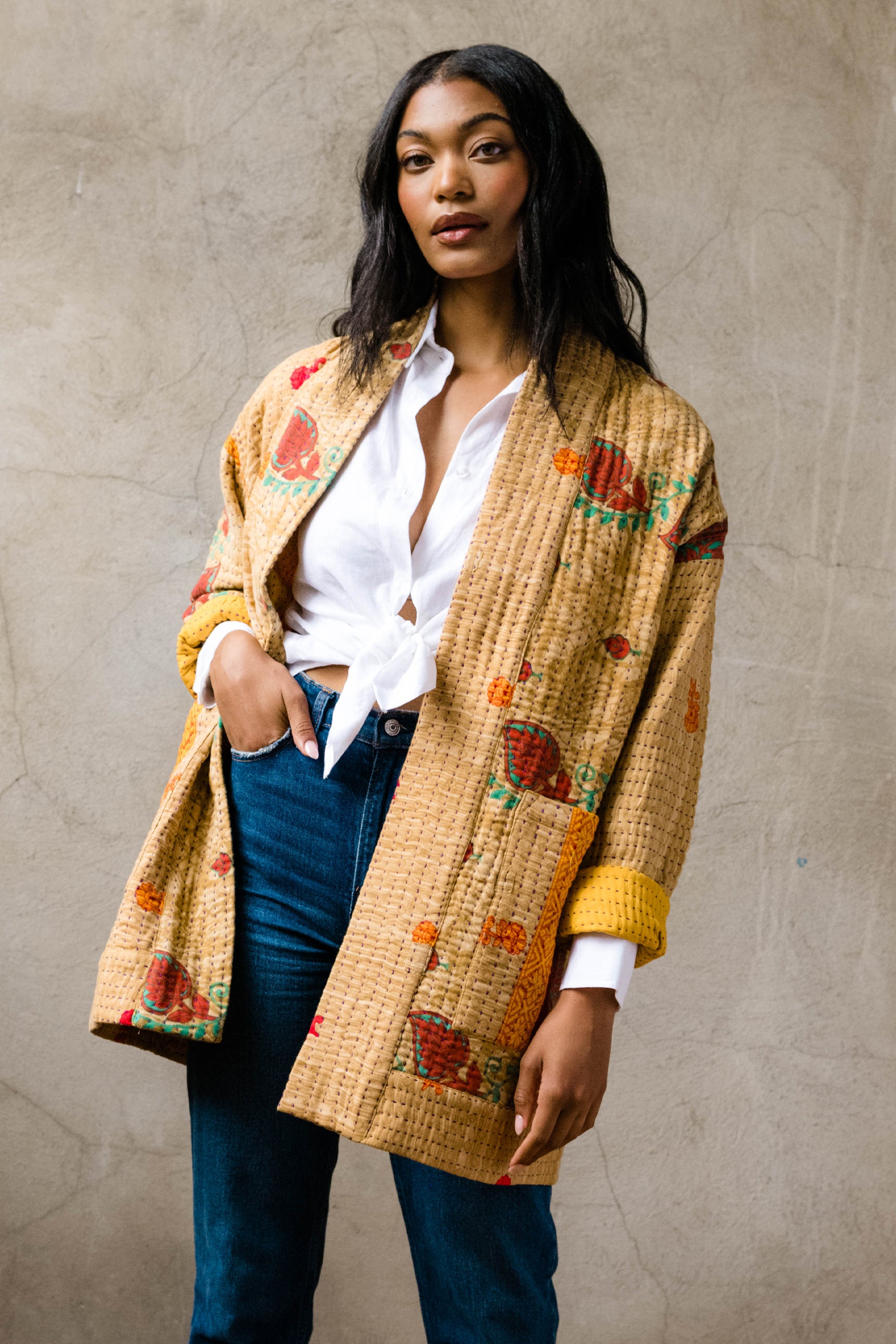 Upgrade your wardrobe with this one-of-a-kind open-front quilted jacket, adorned with two large front pockets and a cardigan jacket design with drop shoulder sleeves. Meticulously crafted and transformed from layers of vintage cotton saris, this unique jacket seamlessly blends the coziness of your favorite quilt with the charm of wearable art.