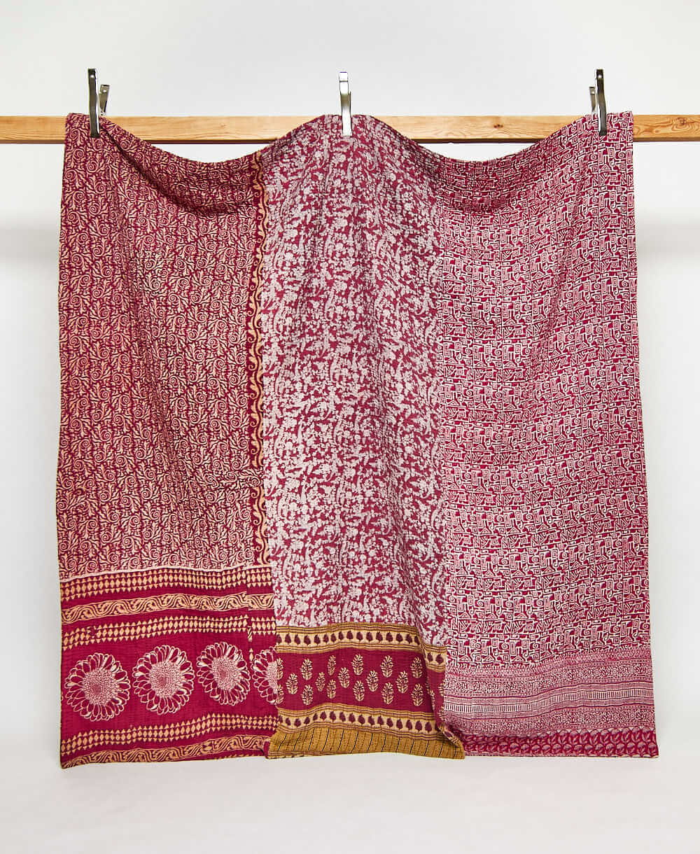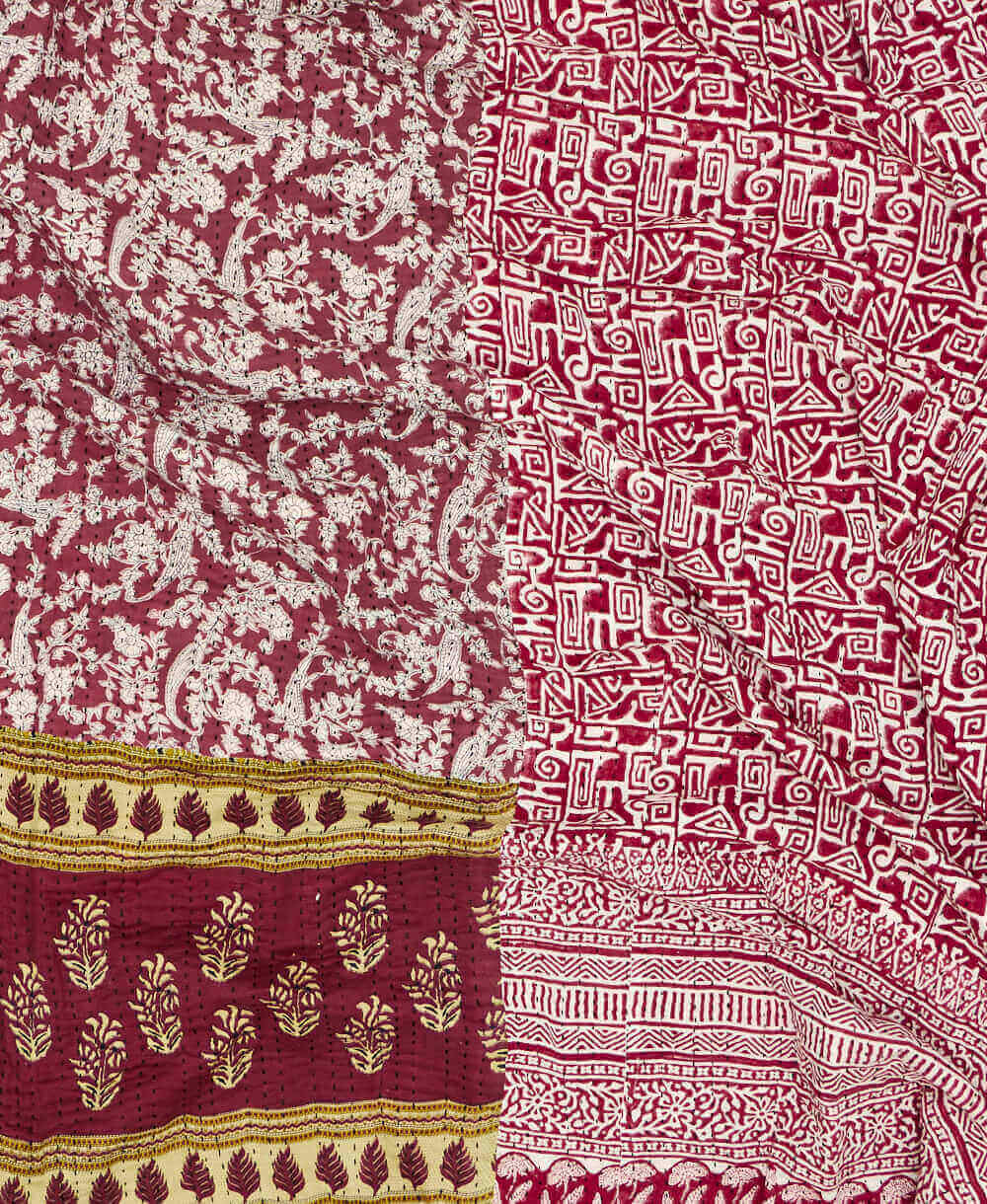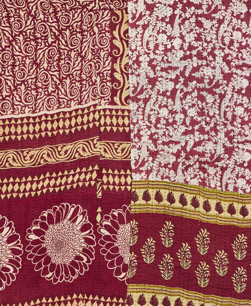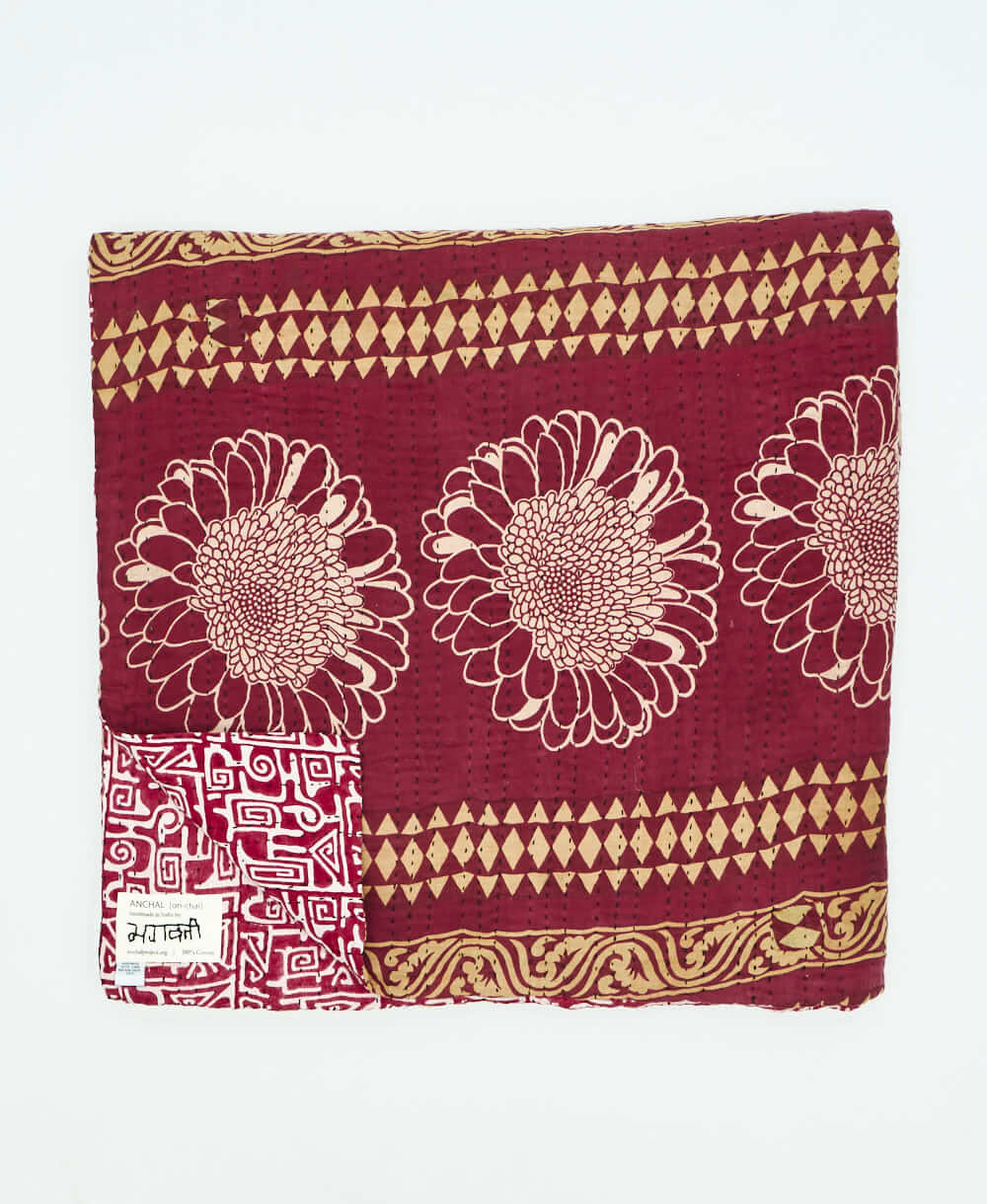 Our queen kantha quilt in a burgundy floral pattern is expertly hand-stitched from start to finish using layers of the highest quality vintage cotton saris. Every stitch reflects our dedication to craftsmanship, ensuring each kantha blanket is not only a functional item but also a work of art. With each quilt being completely one-of-a-kind and unique in pattern, it becomes a statement piece in any room it graces. The signature of the artisan maker on the tag also adds a personal connection, allowing you to appreciate the hands that created it.